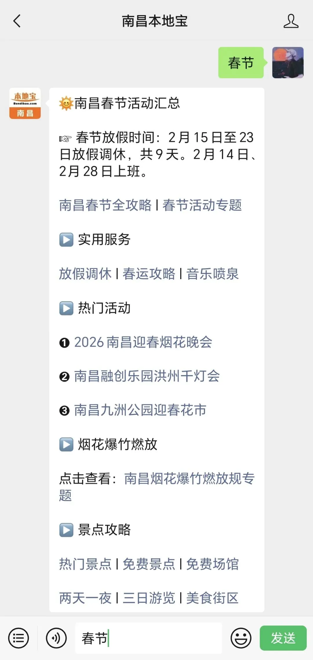 南昌本地宝推出非常多的功能,进入【南昌本地宝】公众号聊天对话框里,点击发消息,在对话框内输入并发送对应的【关键词】即可获取相关内容。