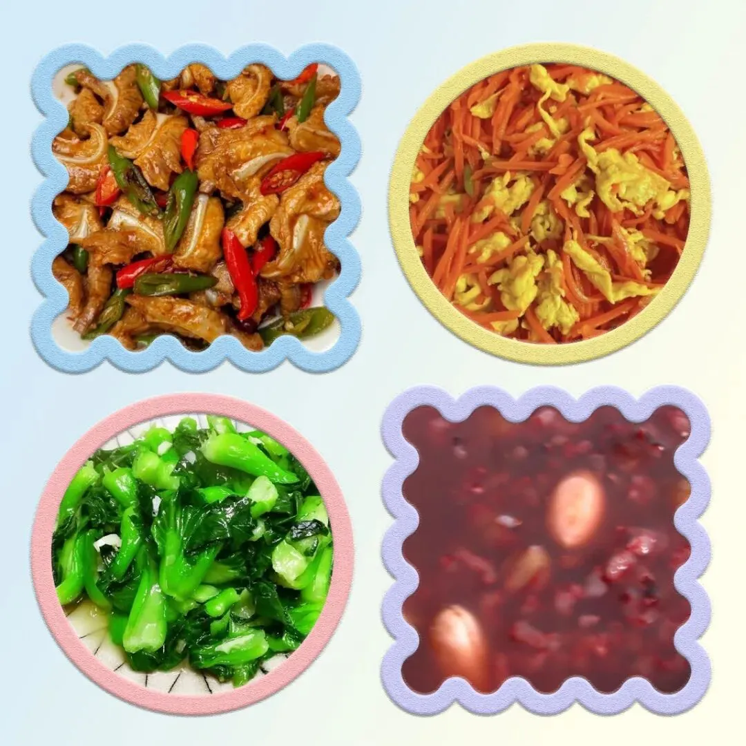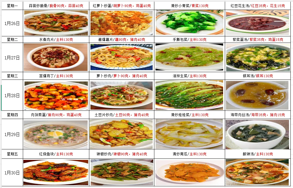 周一,脆骨炒蒜苔,胡萝卜炒鸡蛋,油淋青菜,红豆汤。