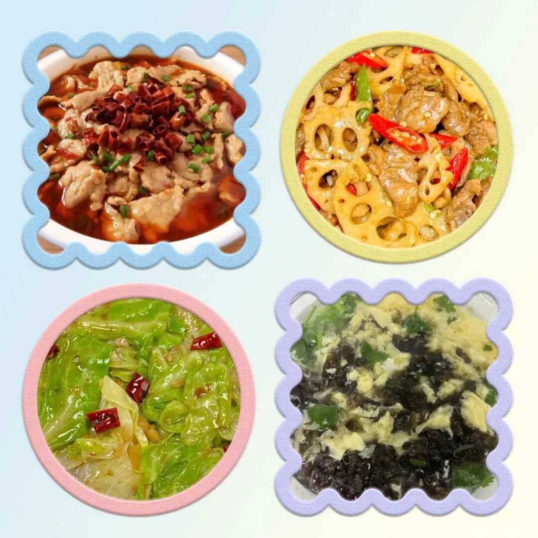 周二,水煮肉片,酱爆藕片,手撕包菜,紫菜蛋汤。