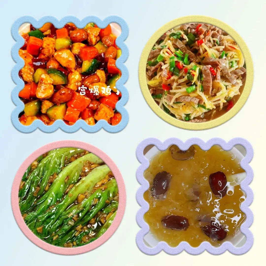 周三,宫保鸡丁,白萝卜丝炒肉,油淋青菜,银耳汤。