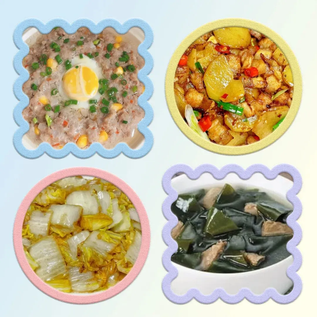 周四,鸡蛋肉饼,土豆炒肉,清炒娃娃菜,海带丝肉丝汤。