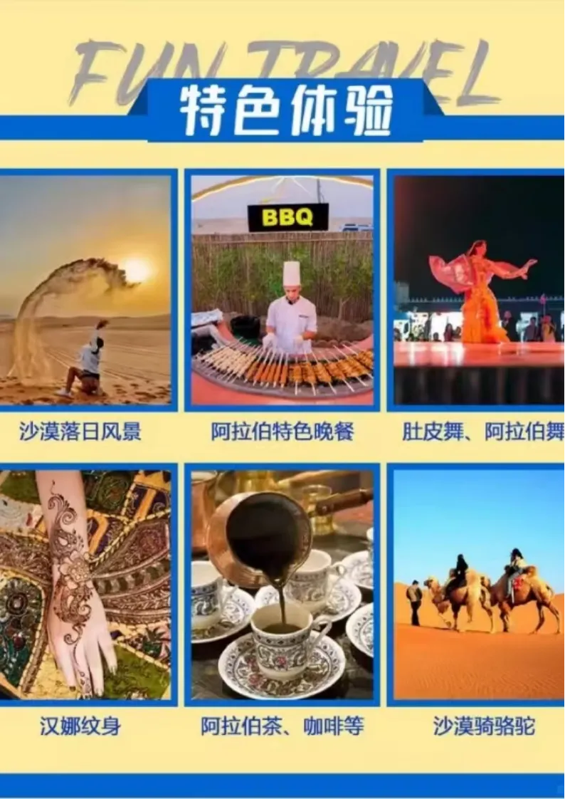 特别赠送:【阿拉伯沙漠冲沙之旅】(观日落+骑骆驼+汉娜手绘+歌舞表演+沙漠烤肉晚餐)(须提前预定,参加的客人不做单独退餐费,价格已经包含原来的餐费):指定时间及酒店内接贵宾,进入沙漠地带,穿梭于起伏不定的沙丘。途中经停沙漠中央的营地,可尝试滑沙的乐趣及拍下夕阳西下的沙漠壮景。最后的沙漠营地为狂欢大本营:欣赏正宗的肚皮舞表演,与漂亮的舞娘一起翩翩起舞;享用美味独特的阿拉伯烧烤晚餐,免费品尝阿拉伯水烟、饮用各种饮料(含酒精类的除外)、还可以穿阿拉伯服饰拍照留念和绘画阿拉伯特色的手绘(时间15:30-21:30)(如遇斋节则取消)(因自身原因放弃费用不退)(游玩约5-6小时)。