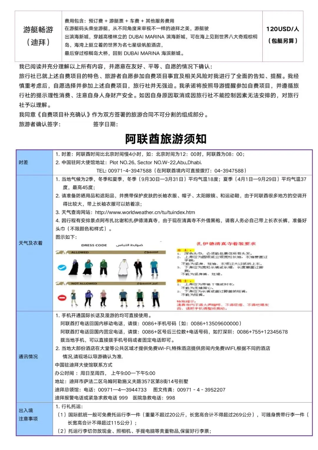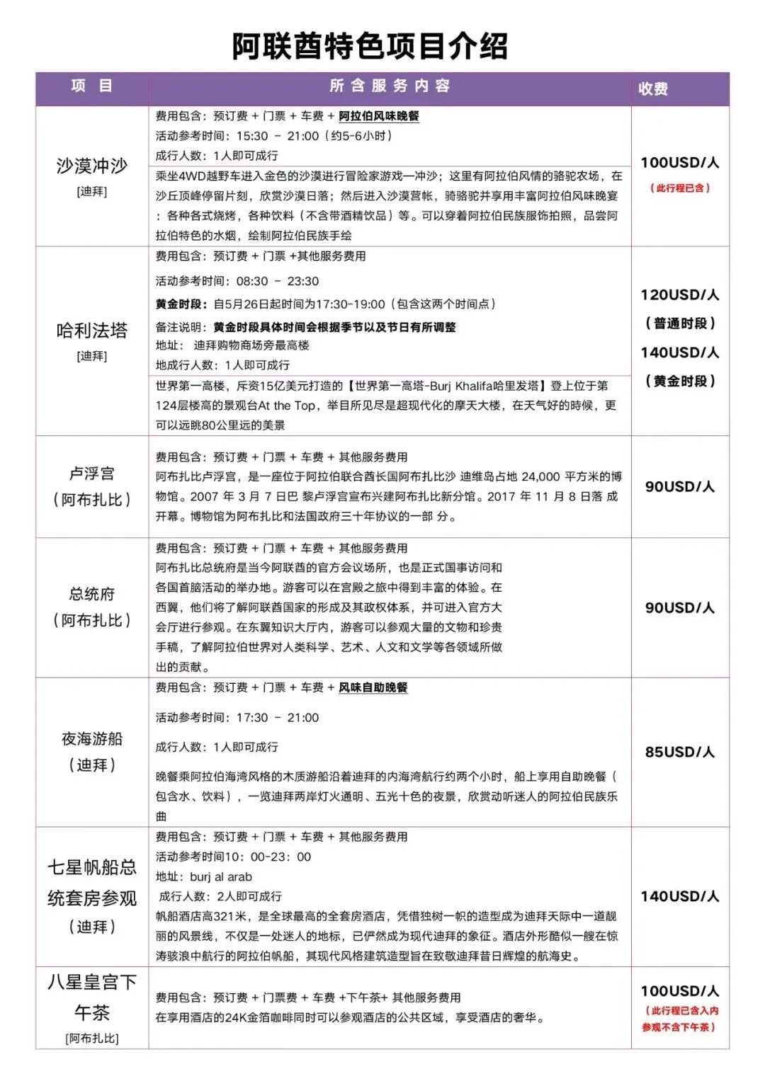1、 阿联酋有很多特色体验项目,由于个人兴趣不同,以下尽可能展示所有项目,不代表境外要参加所有项目,您可以根据自己的喜好自愿选择;2、所有自费项目绝不强迫,如达到自费项目对应的成行人数,在时间、天气等因素允许,且不影响其他旅游者行程的前提下,旅行社可予以安排。如因行程安排、天气、景区临时关闭等原因无法安排,请您理解;3、 自费项目参加与否,由旅游者根据自身需要和个人意志,自愿、自主决定,旅行社全程绝不强制参加自费项目。如旅游者不参加自费项目的,将根据行程安排的内容进行活动。4.、自费项目为统一标价,简要内容参见本补充协议的自费项目介绍,如您同意参加,须在表格上勾选后书面签字确认。一旦发生纠纷,我社将把您签字确认的文件作为处理依据,以保证您的权益;5、价格为达到成行人数的优惠价,如果人数不足报价将会上涨,具体售价根据参加人数而上涨。或导游将取消自费活动的安排,请您谅解;6、 请您在选择自费项目之前慎重考虑,一旦确认参加并付费后,导游将会进行预订,费用产生后旅游者取消,将无法退还您费用。含餐自费项目的价格为在当日午(或晚)餐费用的基础上补的差价。7.、热气球/快艇/游船/游艇/沙漠摩托/沙漠冲沙/吉普车四驱车巡游/登山/缆车等活动,均具有危险性,请充分了解活动知识,在尝试参加上述激烈运动时,请务必穿戴好防护用具,严格遵守当地相关安全规定,在安全标识圈定区域内活动,听从相关人员指挥。不要因为寻求刺激、“挑战极限”、拍照而大意、逞能或心存侥幸等因素,给自己造成不必要的意外伤害。8、 此自费项目表为境外8月1日更新价格,详细见下表。地址:赣州市章贡区迎宾大道6号水韵花都东区(森茂超市隔壁)