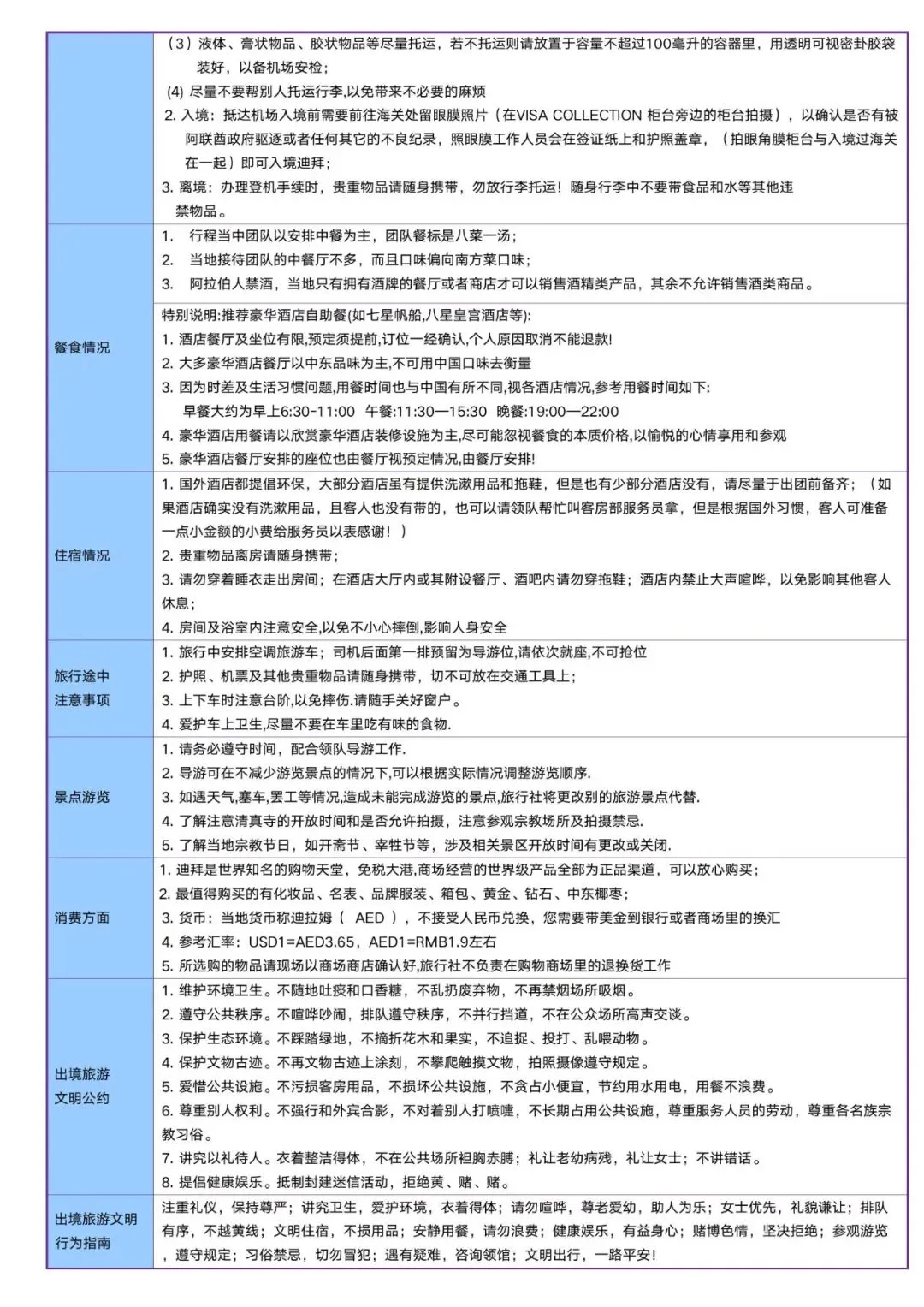 1、住宿:4晚阿联酋国际四星酒店+2晚成都机场附近酒店,以上酒店如遇特殊情况更换同级2、用餐:4早5正,特色小火锅+网红手抓海鲜饭+沙漠营地烤肉餐+中式团餐。酒店内西式自助早餐,用餐时间在飞机或船上以机船餐为准,不再另补,如因自身原因放弃用餐餐费不退3、交通:赣州往返迪拜飞机(四飞);旅游空调大巴车(保证一人一正座) 4、导游:全程中文优秀领队陪同/专业当地中文导游/当地专职司机5、景点:行程中所列之常规景点首道门票,行程表中标明的景点游览顺序和停留时间仅供参考,如因自身原因放弃参加费用不退(注:外观帆船酒店将安排到最适宜拍照的地方观赏,非酒店门口拍照)6、购物标准:行程内经过的景区商店、餐厅、商场、集市、中途或休息站等商店不属于旅游,定点购物店,若游客在此类购物店所购买的商品出现质量问题,旅行社不承担任责任7、自费标准:以行程表所安排的自费项目为准,不增加额外行程项目(须经全体团员签字同意方可增加),具体安排详见《自费项目表》8、机票:往返全程团队经济舱机票及税金;团队机票不允许改名、退票、改票、改期,行程内航班号及时间均为参考,具体均以航空公司安排时间为准,如遇人力不可抗因素造成的航班延误或损失,由游客自行承担10、如客人要求境外离团,需补离团费1000元/人/天;离团后将终止所有合同,游客未享受的服务(其中包括车、餐、导、酒店、机票)均视为自动放弃,我社不再提供任何地接服务,离团后客人一切行为及后果与本社无关!1、境外司机服务费280美金/人(折合人民币2000元/人),随团费一起交或现交给领队