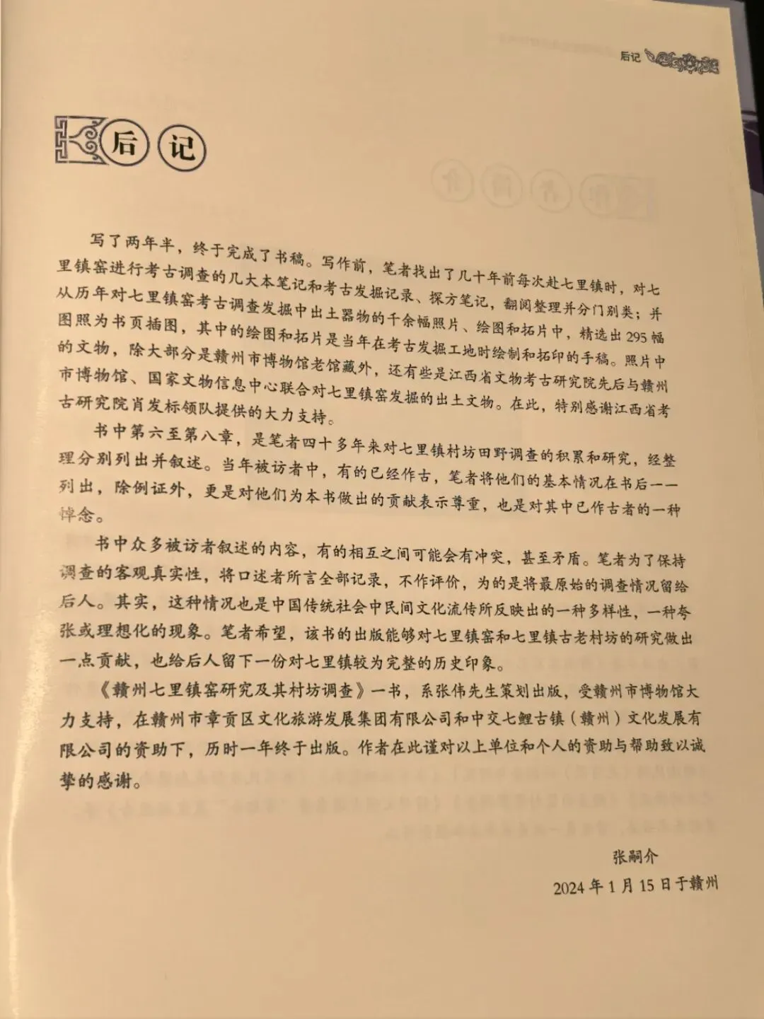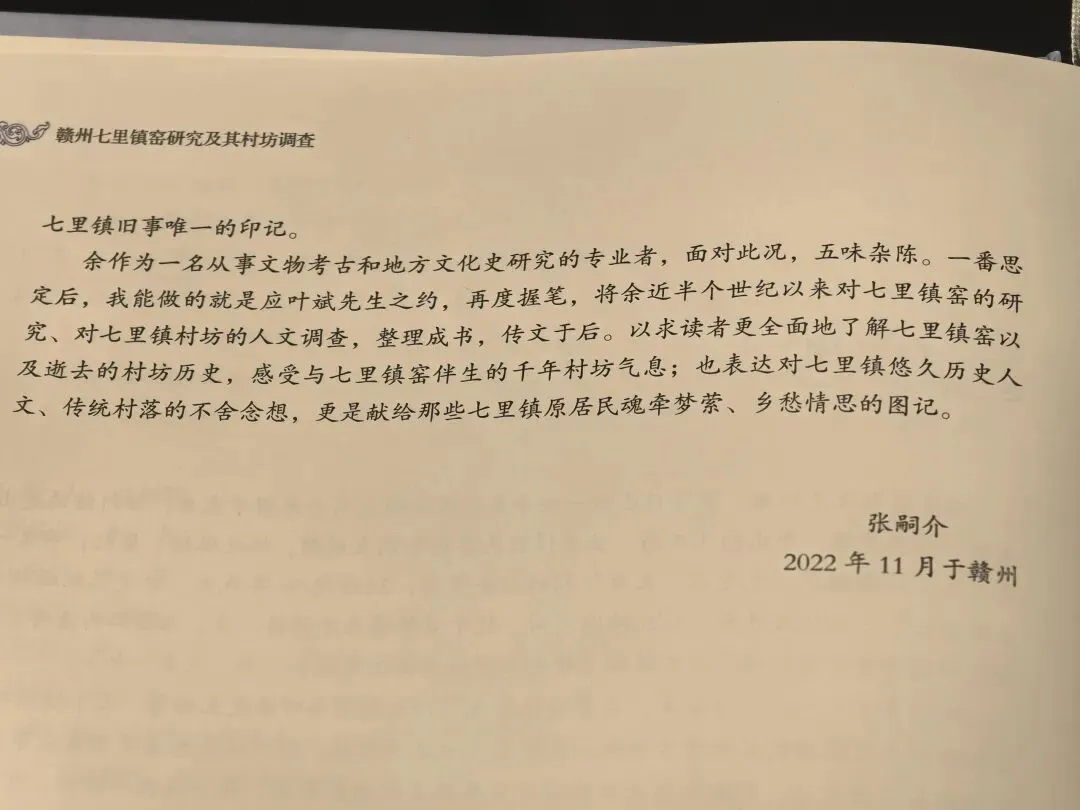 我认为张嗣介先生新书问世有三个突破:一是赣南考古笔记第一次整理出版;二是文物工作者村坊调查,堪称古村史志;三是多方看好七里窑题材并资助出版。