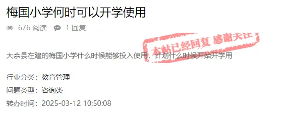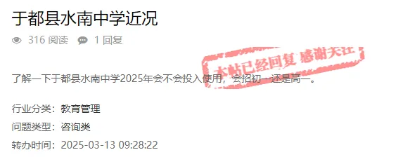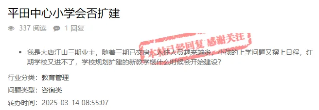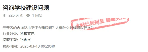 经调查核实,吉祥路小学目前已完成平场,项目建设已纳入2025年建设计划,正在筹措资金推动开工建设。3月13日已与反映人电话联系,就其咨询问题进行答复,反映人表示认可。