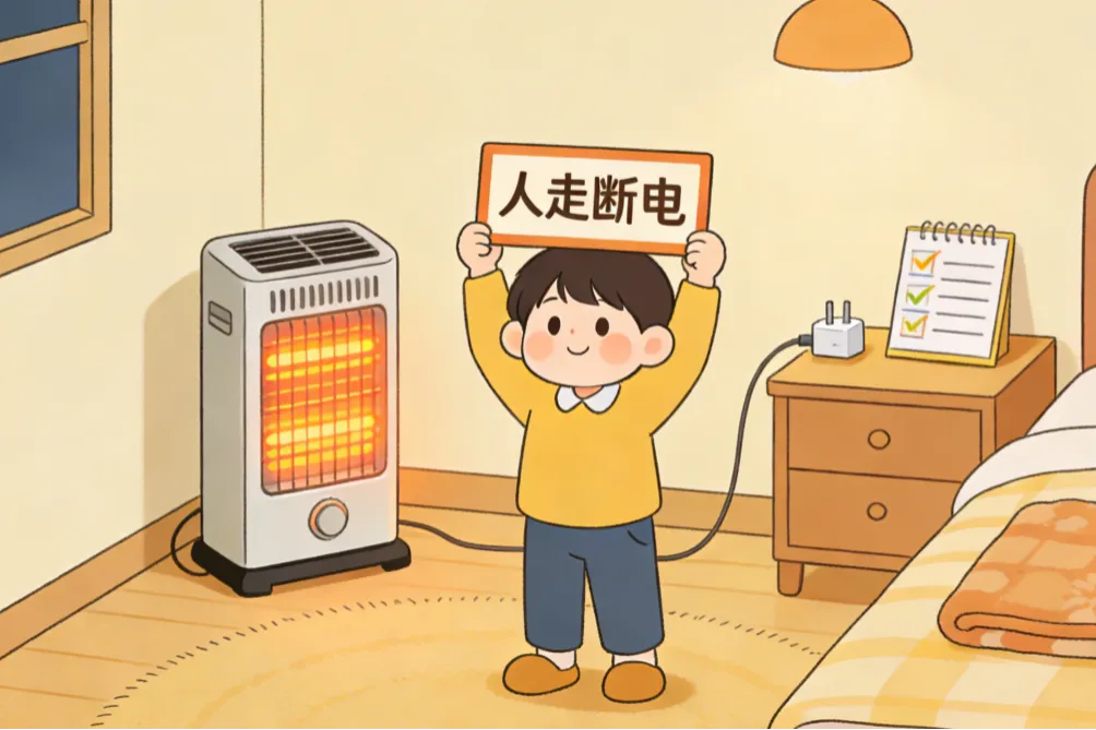 2.取暖设备远离易燃物,不覆盖衣物,人走断电;电热毯不整夜使用,不折叠存放。