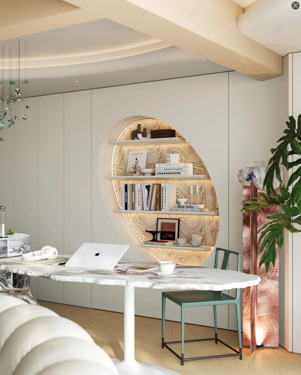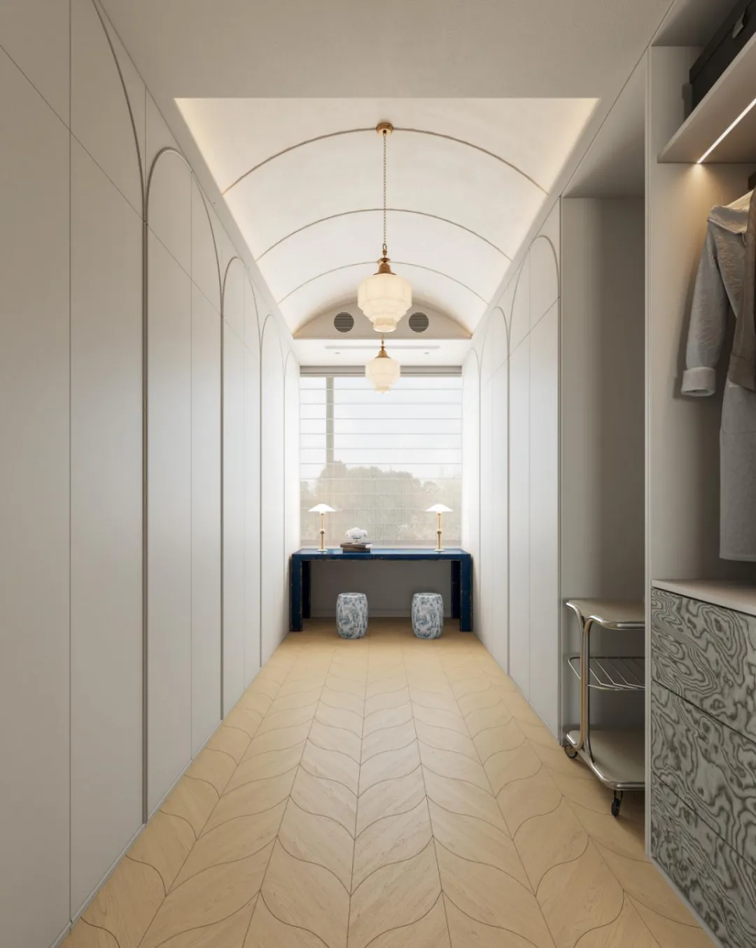 米白色的定制柜体以舒展的线条铺开宁静的底色,拱形天花板垂落如静谧的天穹,每当灯光亮起,线性灯带便散发出柔和的光芒,将整个空间笼罩在温暖的氛围之中。地面的波浪形鱼骨拼接地板,如同流动的音符,让挑选与搭配都成了一次次优雅的时尚之旅。嵌于其中的线性灯带散发出月光似的柔光,均匀漫射,将每一寸空气都染上宁谧。