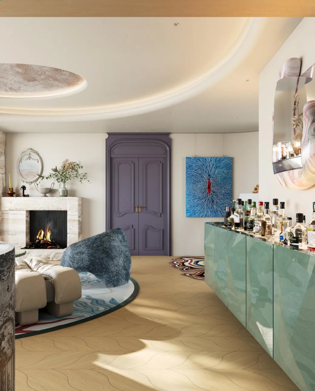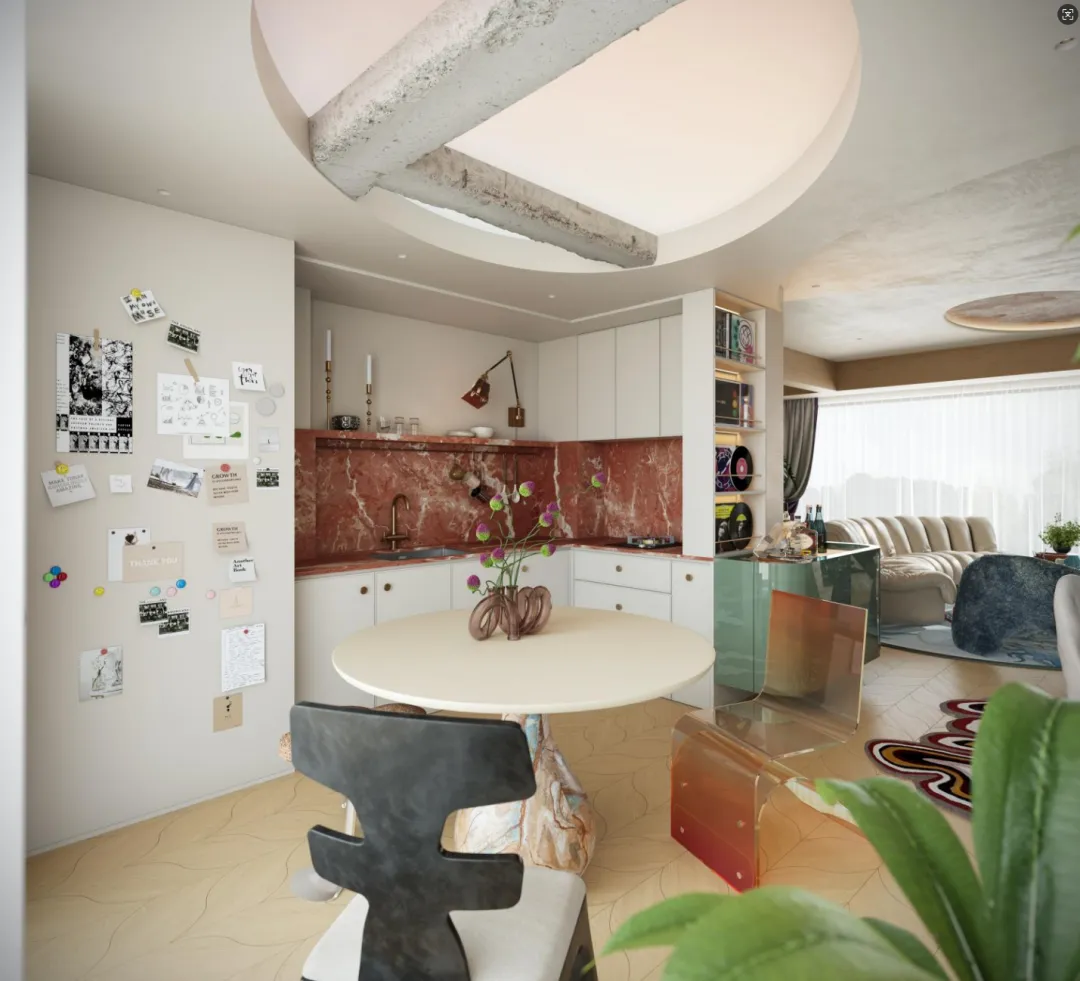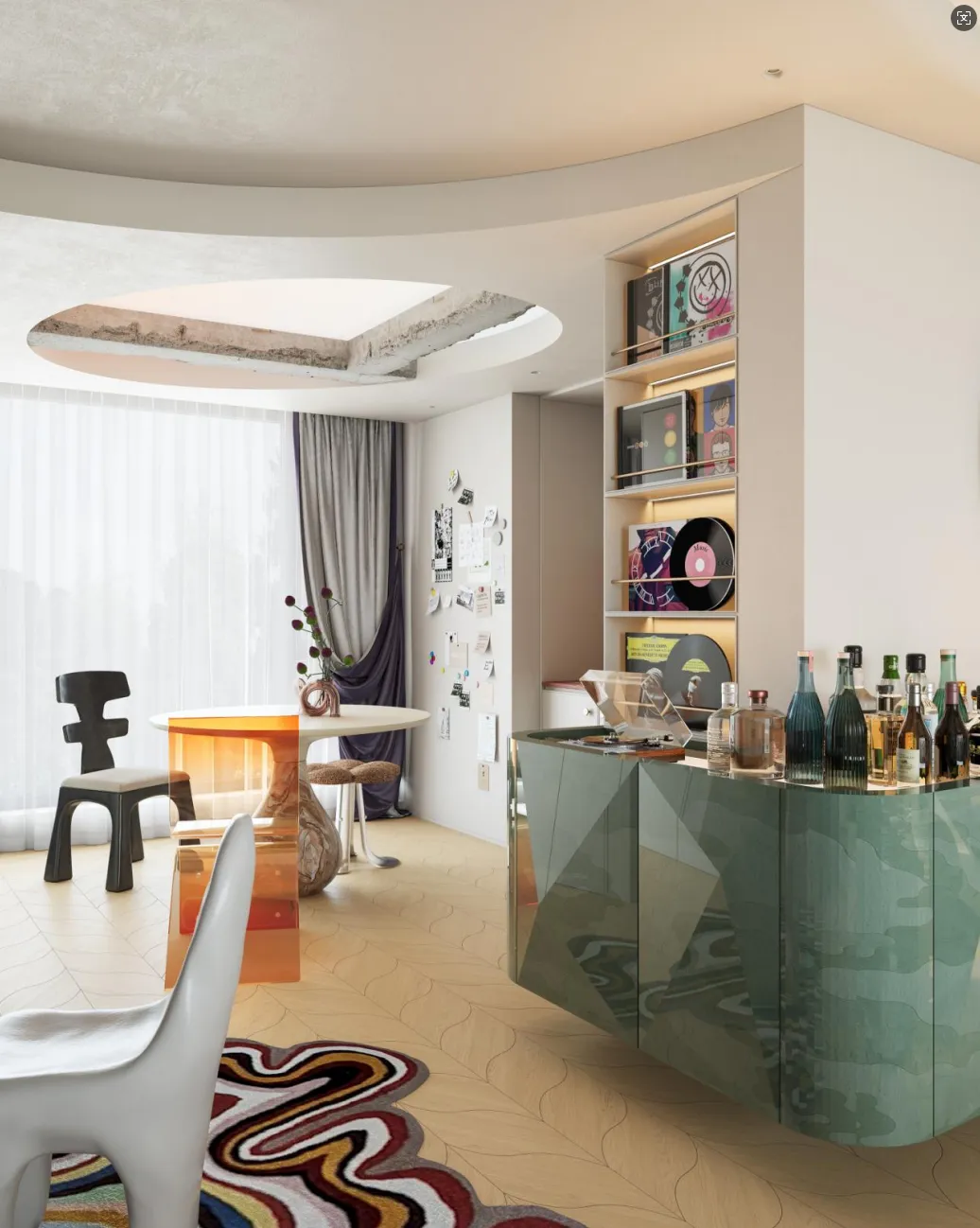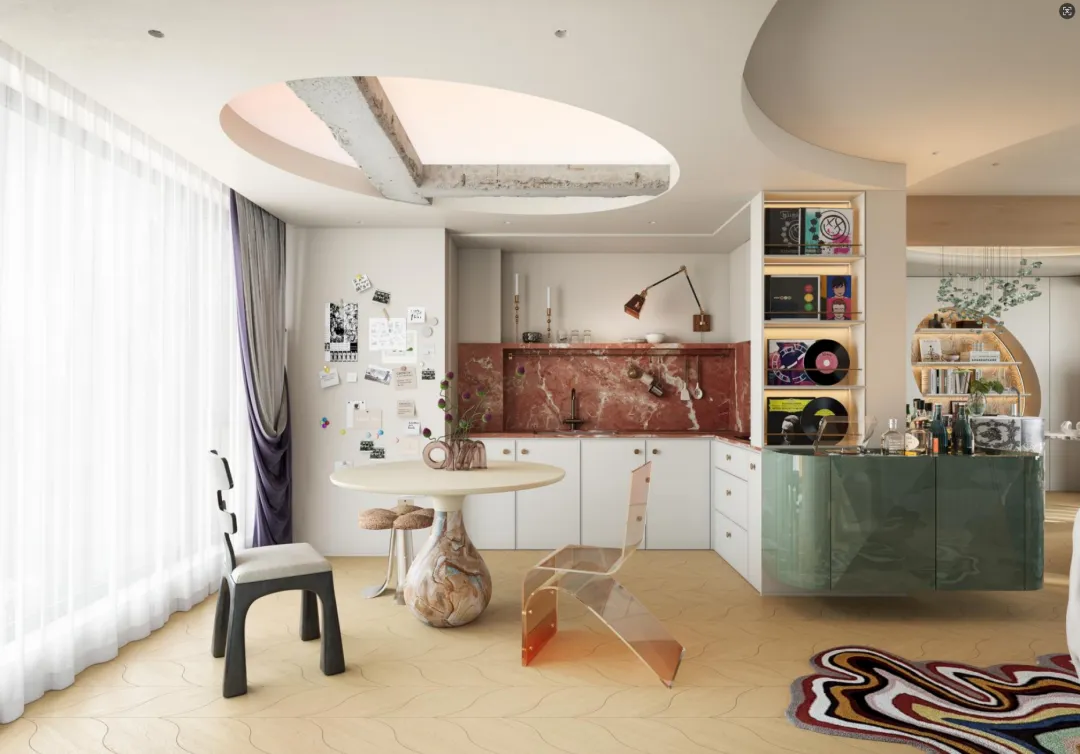 厨房的设计大胆而富有巧思——法国红的岩板台面与酒柜的翡翠绿,展开一场热烈而优雅的视觉对撞。头顶的可变色软膜天花,则如一片私属的暮色天幕;每当夜色垂落,灯光便随心情悄然变换。音乐从唱片机里流淌而出,和着杯中威士忌的暖光,让烹饪与独酌都成了一帧帧流动的氛围画。在静谧中邂逅浪漫