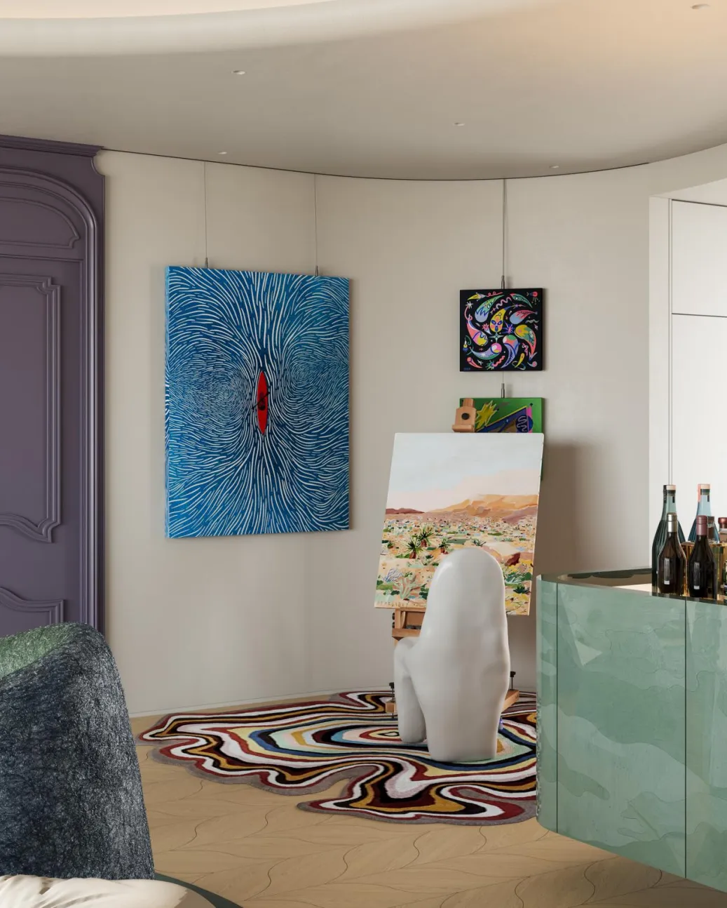 绘画区:调酒去区的旁边是女孩的绘画区域。灵感降临时,一杯威士忌伴着一张契合心绪的唱片,画笔起落间,铺开的是内心无声的叙事,那些未完成的画布静驻于架上,仿佛时光在此缓行——每一道笔触都是灵光的切片,每一片留白都是故事的呼吸。在这里,女孩可以沉浸在绘画的世界里,用画笔描绘出自己心中的美好。