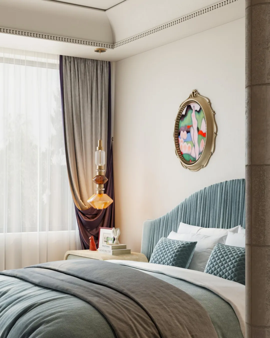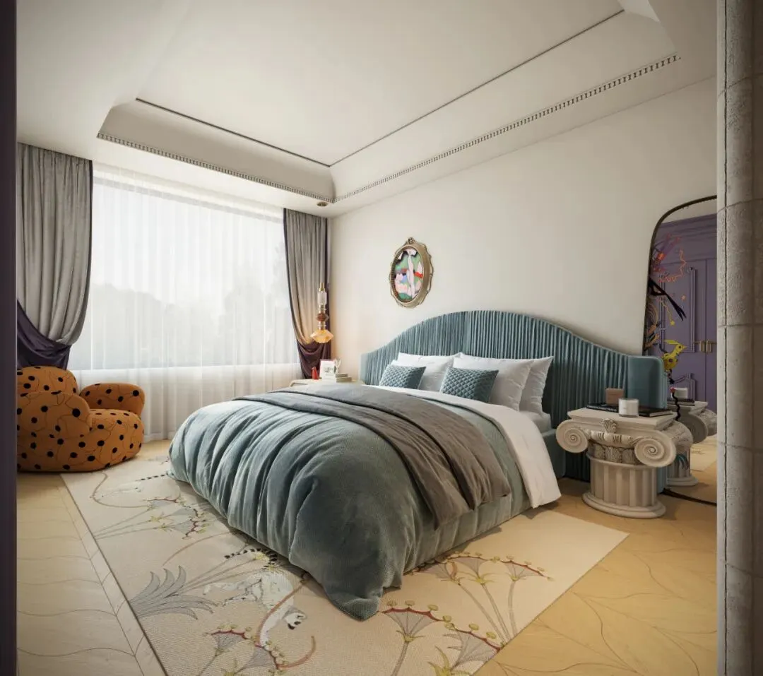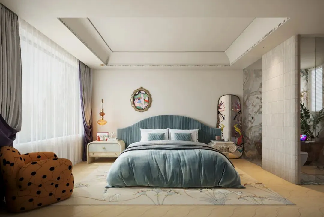 卧室的设计温柔而不失格调——雾霾蓝的绒布床头板与暖橙色的波点沙发,编织出一场宁静与活泼的奇妙交融。头顶的复古吊灯,恰似一颗温暖的星辰;每当夜幕降临,暖黄色的灯光便轻柔洒落,将整个空间笼罩在柔和的光晕之中,打造一个温馨、舒适、浪漫的睡眠环境。在卧室中邂逅浪漫,享受生活的美好。