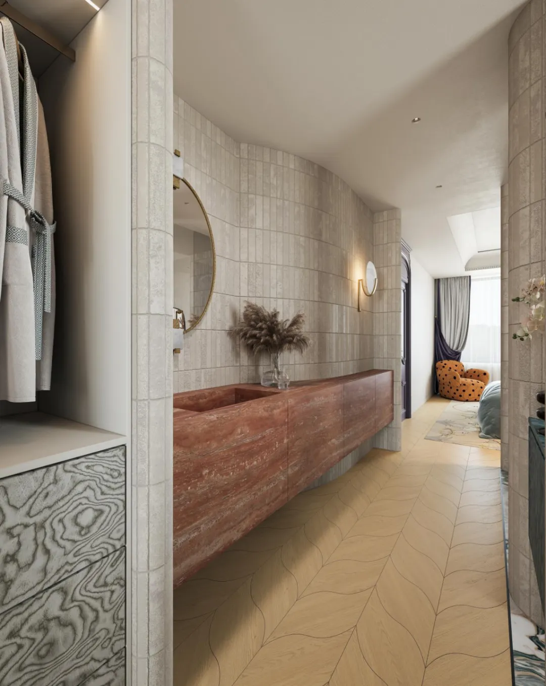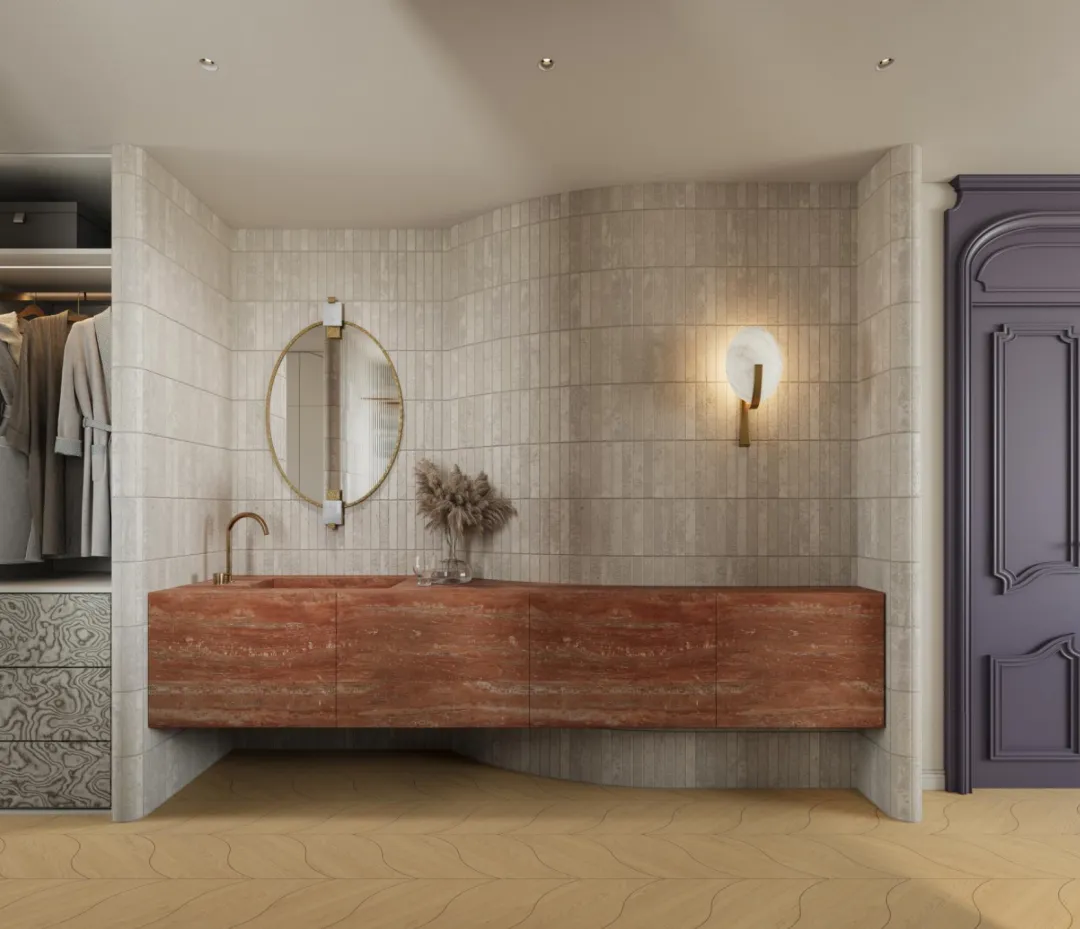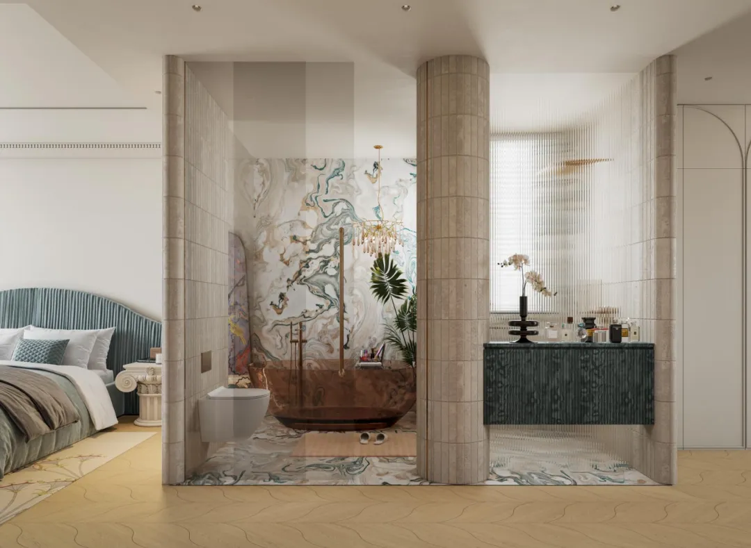 红棕色的悬挂式大理石台柜与深绿岩板相对而立,色彩在冷暖之间展开一场寂静而深沉的对话。头顶的古铜枝形吊灯犹如悬浮的光之雕塑,当灯光点亮,无数水晶坠饰便织出一张温柔的光网,轻轻笼罩整个空间。日光透过竖百叶帘漫入,与室内灯光交织成朦胧的层次,每一次洗漱沐浴,都仿若踏入一幅流动的光影画,身心在此沉静,亦在此苏醒。光影在此被编织成空间的诗行,让衣帽间成为一个温柔包裹的私人体验场。