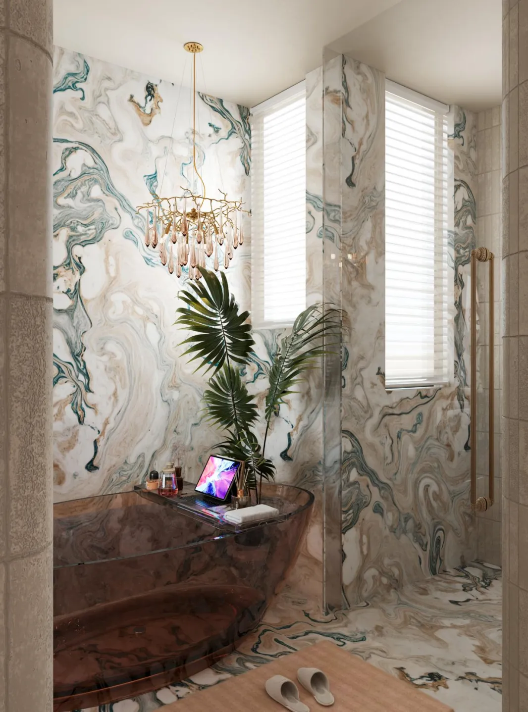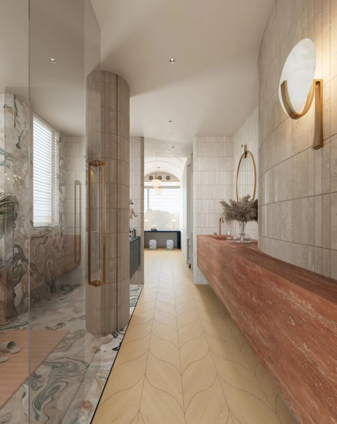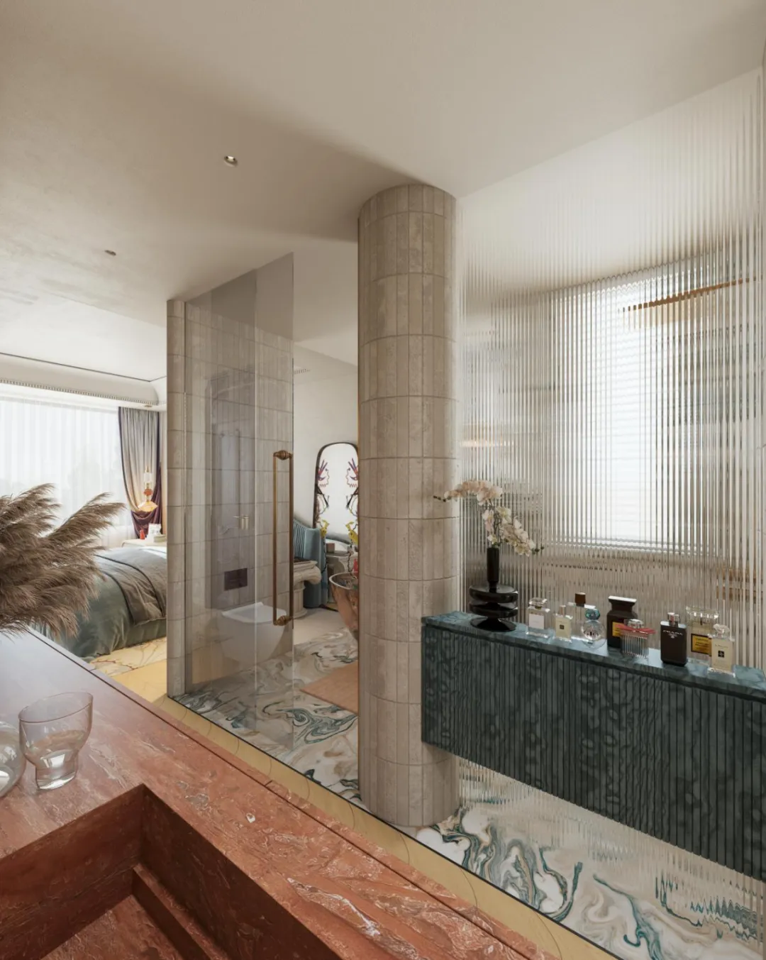 红棕色的悬挂式大理石台柜与深绿岩板相对而立,色彩在冷暖之间展开一场寂静而深沉的对话。头顶的古铜枝形吊灯犹如悬浮的光之雕塑,当灯光点亮,无数水晶坠饰便织出一张温柔的光网,轻轻笼罩整个空间。日光透过竖百叶帘漫入,与室内灯光交织成朦胧的层次,每一次洗漱沐浴,都仿若踏入一幅流动的光影画,身心在此沉静,亦在此苏醒。光影在此被编织成空间的诗行,让衣帽间成为一个温柔包裹的私人体验场。