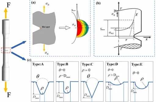 图1:展示了用于表征缺口效应的几何与力学参数示意图。图(a)说明了弹性应力集中因子K_t的概念,它量化了缺口根部的应力放大效应。图(b)描述了缺口尖端的相对应力梯度χ,这是评估应力场变化剧烈程度的另一个关键参数。图(c)则呈现了本研究所涉及的五种具体缺口类型及其定义所需的几何参数(如根部半径ρ、张开角θ、最大深度D_{max}。