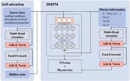 图7:详细描绘了本文核心——AttPINN疲劳寿命预测框架的结构。该框架首先通过一个包含多头注意力层、归一化层和前馈网络层的自注意力模块,将高维原始输入数据转换为低维隐藏状态特征。随后,一个深度神经网络学习从这些特征到预测寿命的映射。同时,一个深度隐藏物理模型(DHPM)接收关键特征及其与预测寿命的偏导数,以学习并约束其背后隐含的物理关系(偏微分方程),共同构成模型的损失函数。