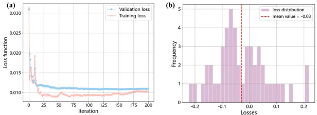 图9:子图(a)展示了在最优超参数组合下,模型训练过程中损失值随迭代次数的变化曲线。可以看出,损失值迅速下降并收敛在接近0.01的理想区域,表明训练过程高效且稳定。子图(b)以散点形式呈现了验证集中每个寿命预测结果对应的损失值大小,绝大多数点的损失值都接近于0,这直观地证明了模型训练结果具有良好的鲁棒性和预测一致性。