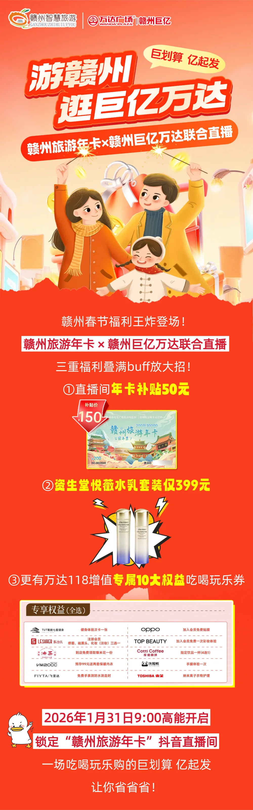 >【正在直播】赣州旅游年卡*赣州巨亿万达,年卡50元补贴,大牌名品直降千元、10大专属权益福利拉满~