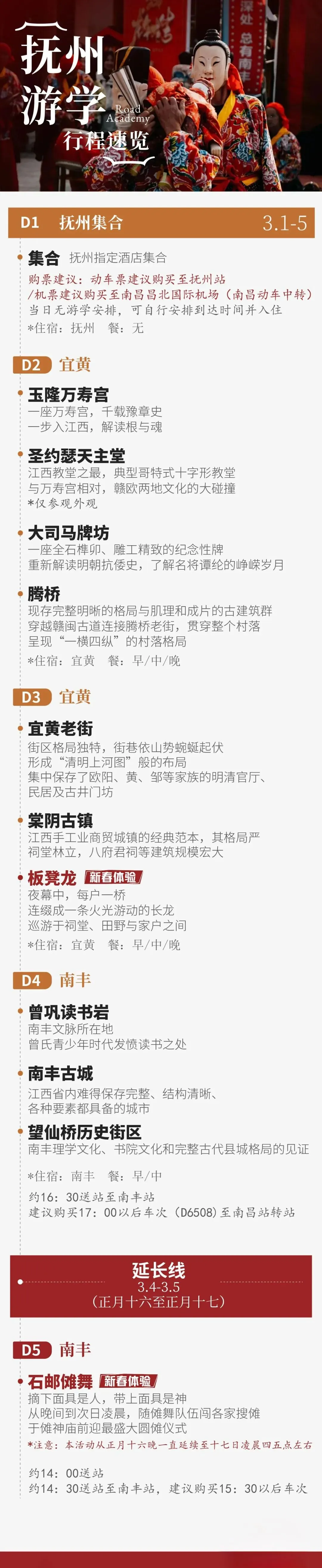 3.参加延长线的朋友送站结束后在南丰用餐,用餐结束后前往石邮观赏傩舞,傩舞将从当晚七八点持续到凌晨三四点左右,结束后由大巴车统一送至南丰酒店休息,下午14:00统一送站南丰站。