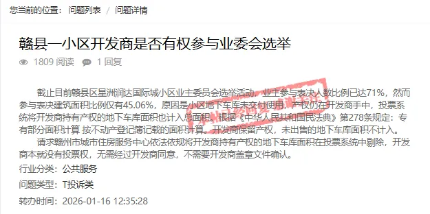 截至1月中旬,星洲润达国际城小区业委会选举参与业主人数比例已达 71%,但参与表决的建筑面积比例仅为 45.06%。业主质疑,未交付使用、仍归属开发商的地下车库面积被计入投票基数,直接影响了选举的法定生效条件。业主诉求明确:请求相关部门依法剔除开发商持有的地下车库面积,确认开发商无投票权,无需其同意或盖章。