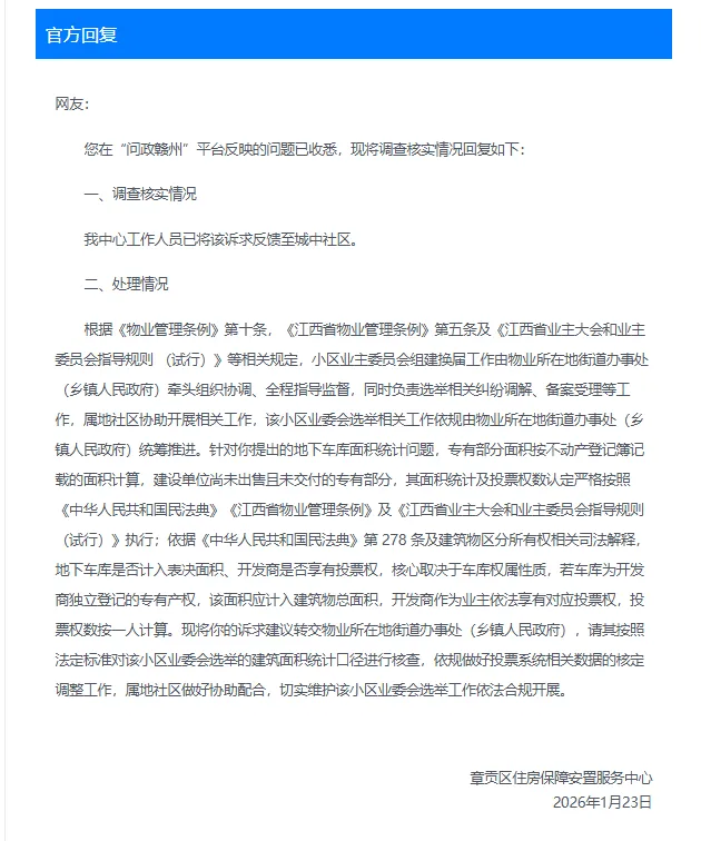章贡区住房保障安置服务中心明确指出,小区业委会组建工作由属地街道办事处统筹推进,地下车库面积是否计入、开发商是否具备投票权,核心取决于车库产权性质。若车库为开发商独立登记的专有产权,应计入建筑总面积,开发商作为业主依法享有对应投票权,且投票权数按一人计算。基于此,区住房保障安置服务中心已将诉求转交属地街道办事处,要求其依法核查面积统计口径,调整投票系统数据,并由属地社区配合落实,以保障选举工作合规开展。
