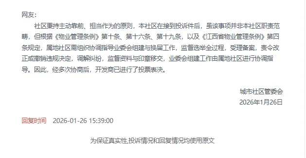 城市社区管委会在后续回复中表示,虽该事项并非社区直接职责范畴,但依据相关法规,属地社区需组织协调指导业委会组建与换届工作,监督选举全过程,受理备案,责令改正或撤销违规决定,调解纠纷,监督资料与印章移交,业委会组建工作由属地社区进行协调指导。因此,经多次协商后,开发商已进行了投票表决。