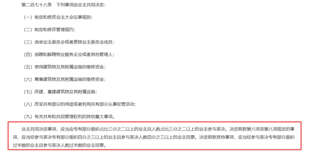 《中华人民共和国民法典》第278条规定,确立“专有部分面积+业主人数”双占比表决规则,明确这两个指标是选举生效的关键,为后续细化规则定调。
