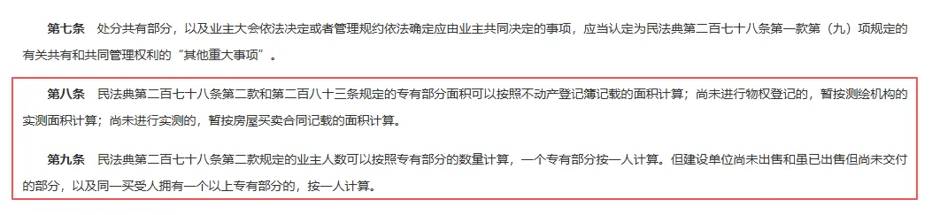 《最高人民法院关于审理建筑物区分所有权纠纷案件适用法律若干问题的解释》第8条:明确 “专有部分面积按照不动产登记簿记载的面积计算”,为面积认定提供了法定依据。第9条:规定 “建设单位尚未出售和虽已出售但尚未交付的部分,按一人计算”,从人数维度限制了开发商的投票权重,间接呼应了 “未交付资产不应过度影响表决” 的立法意图。该条是对业主共同表决时 “人数占比” 的细化,明确开发商手中未出售、未交付的专有部分,在计算业主人数时仅按1人计算,而非按面积对应的户数计算,以此限制开发商在业主大会中的投票权重。