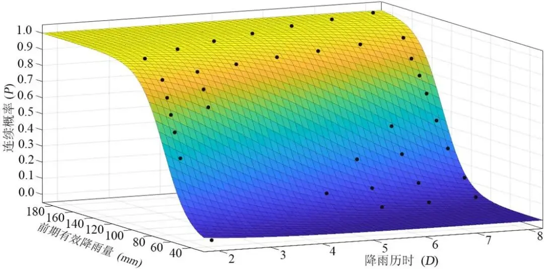 研究的第一项关键任务是建立连续概率降雨阈值模型。传统的EE-D阈值法只能给出几条代表不同发生概率的分级阈值曲线。本研究对此进行了革新:首先,基于历史数据计算出传统EE-D曲线上一系列密集的离散概率点(从P=0到P=1,间隔0.05)所对应的前期有效降雨量(EE)和降雨历时(D)组合。前期有效降雨量EE通过公式计算: