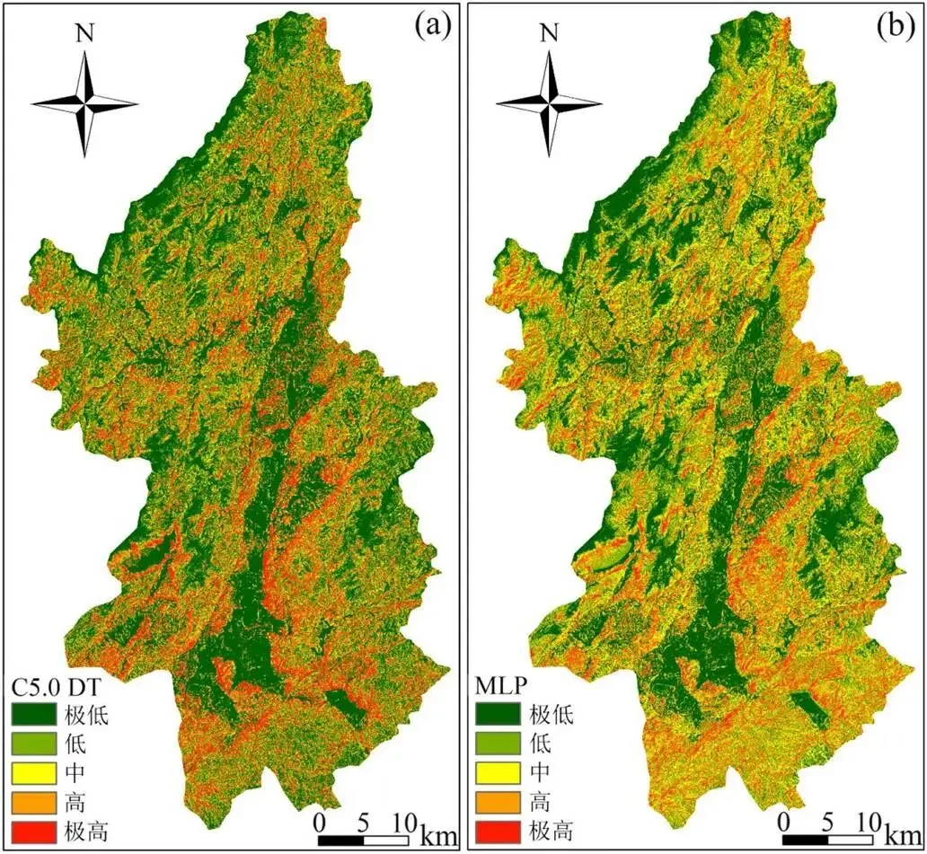 图 2 C5.0 DT 易发性分级图 (a) 和 MLP 易发性分级图 (b)