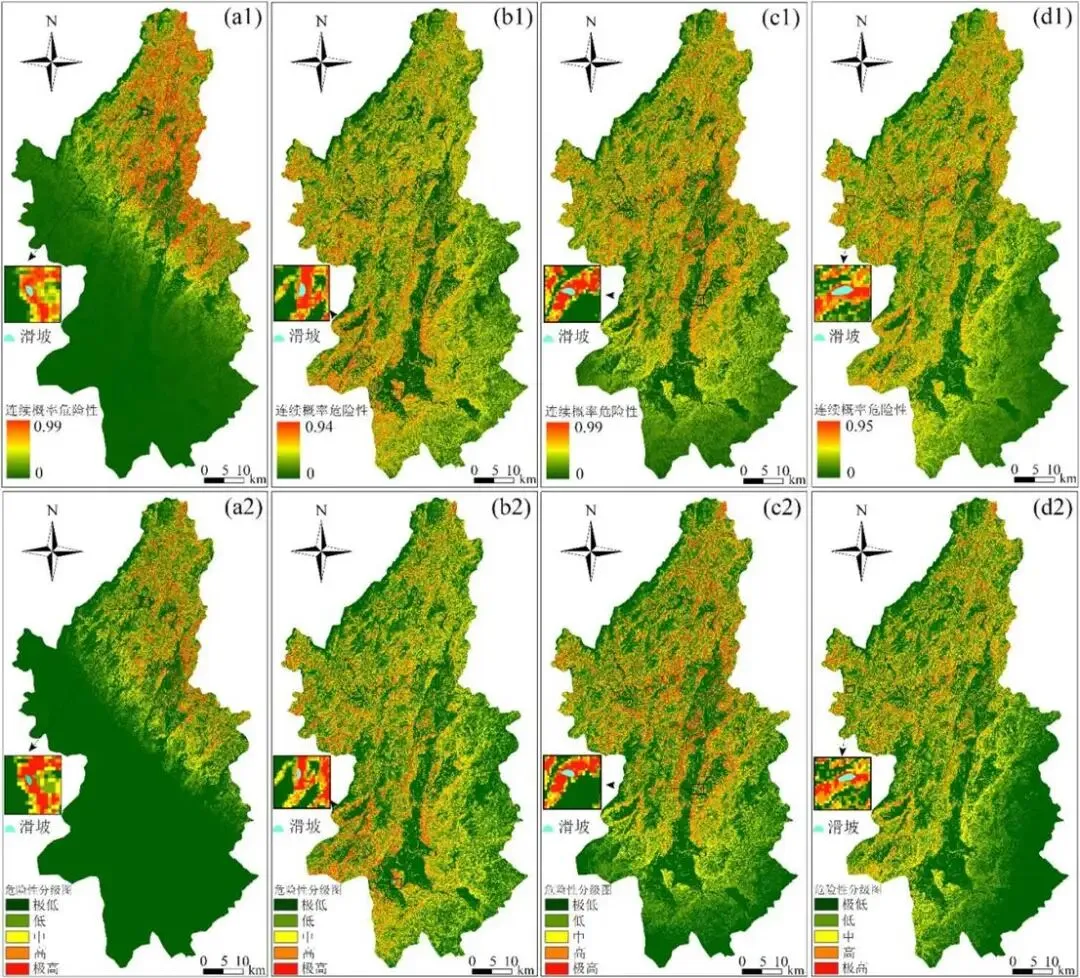 图 5 各降雨事件滑坡当天连续概率滑坡危险性图(a1~d1各降雨事件下的连续概率危险性预警图,a2~d2连续概率危险性预警图对应的危险性级别划分图)