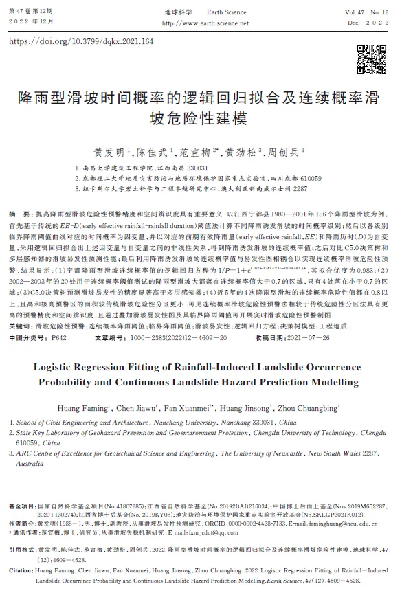 该研究成果发表在期刊 《地球科学》 上,详细内容见:黄发明, 陈佳武, 范宣梅, 等. 降雨型滑坡时间概率的逻辑回归拟合及连续概率滑坡危险性建模[J]. 地球科学, 2022, 47(12): 4609-4628.