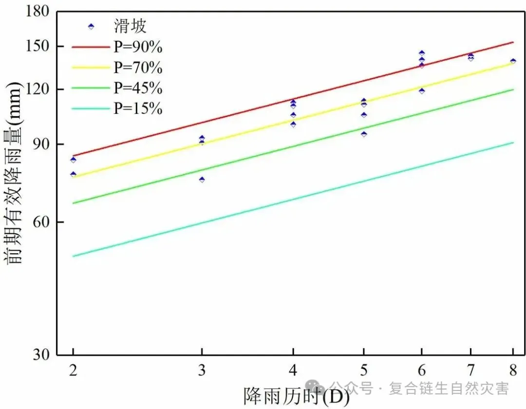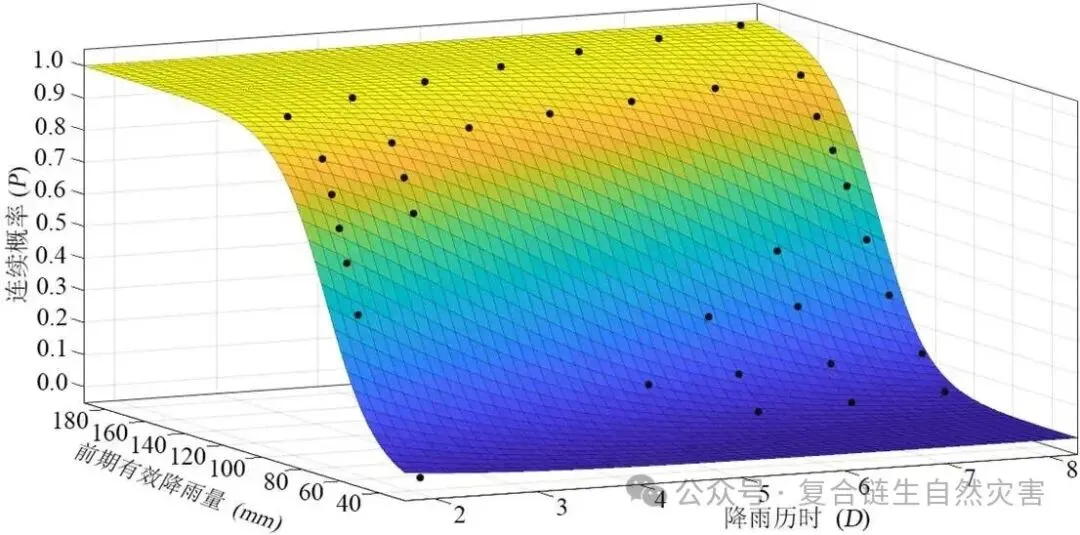 研究的第一项关键任务是建立连续概率降雨阈值模型。传统的EE-D阈值法只能给出几条代表不同发生概率的分级阈值曲线。本研究对此进行了革新:首先,基于历史数据计算出传统EE-D曲线上一系列密集的离散概率点(从P=0到P=1,间隔0.05)所对应的前期有效降雨量(EE)和降雨历时(D)组合。前期有效降雨量EE通过公式计算: