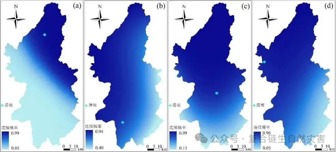 最终的连续概率滑坡危险性预警模型通过一个乘法耦合实现:将上述动态的降雨连续概率图层与静态的滑坡易发性指数图层进行逐像元相乘。这一运算在物理意义上融合了“降雨触发滑坡的可能性”与“此地本身容易发生滑坡的程度”,从而生成了一个既能反映降雨时空动态、又能体现地质环境本底差异的综合性、定量化危险性预警图谱。