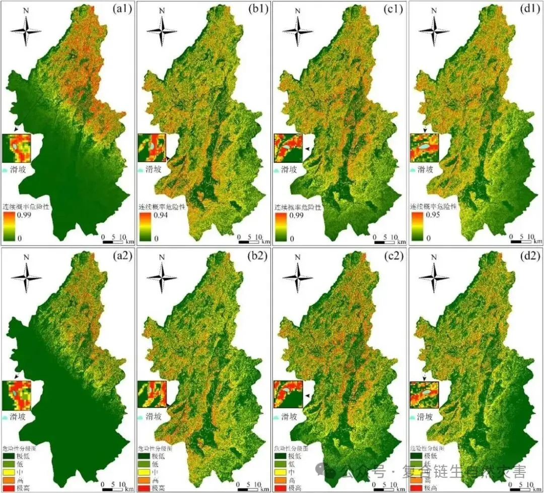 图 5 各降雨事件滑坡当天连续概率滑坡危险性图(a1~d1各降雨事件下的连续概率危险性预警图,a2~d2连续概率危险性预警图对应的危险性级别划分图)