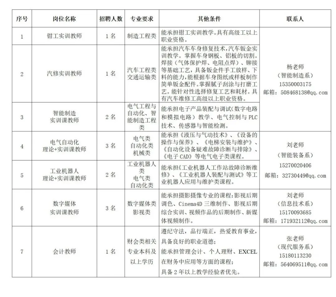 (二)实训课教师要求具有大专及以上学历,或高级技工学校、技师学院高级工班毕业、技师学院预备技师(技师)班毕业;理论课教师要求具有本科及以上学历;