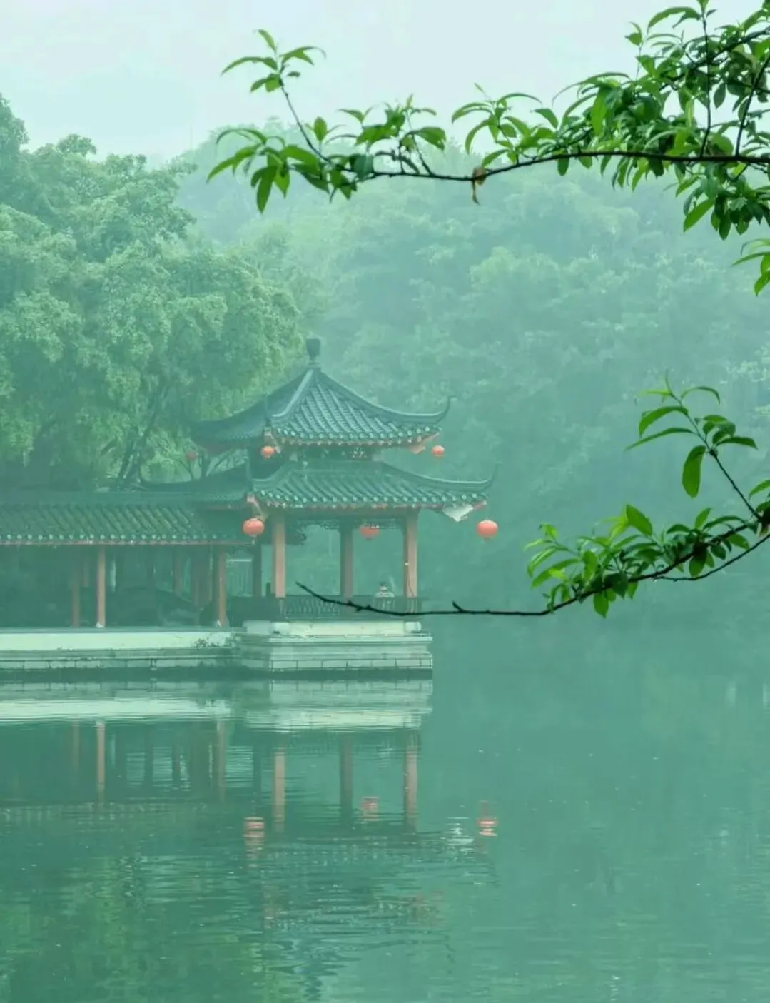诗中“彩霞隐遁湖底”“水天一色相望”,开篇便以静谧的湖景铺陈,为等待的情绪铺垫底色。“沸腾的烟雨,磨砺爱恨的种子”,将烟雨的动态与爱恨的抽象情感绑定,让自然景象成为情感的载体。而“天青色等烟雨,鸟雀荡开湖水沉思”,化用汝窑天青色需待烟雨方能成瓷的典故,把对爱情的执着守望,化作天青色对烟雨的期盼,让等待有了具象的美感与宿命感。