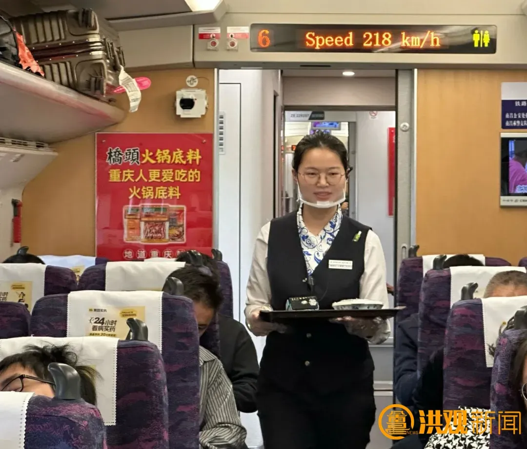 “G1384次列车即将进站,送餐员请准备!”对讲机一响,熊虹便背起近十斤的送餐箱,快步奔向南昌西站指定站台。高铁停靠仅两分钟,她的工作,就是在这精确到秒的时间内,完成餐食的交接。