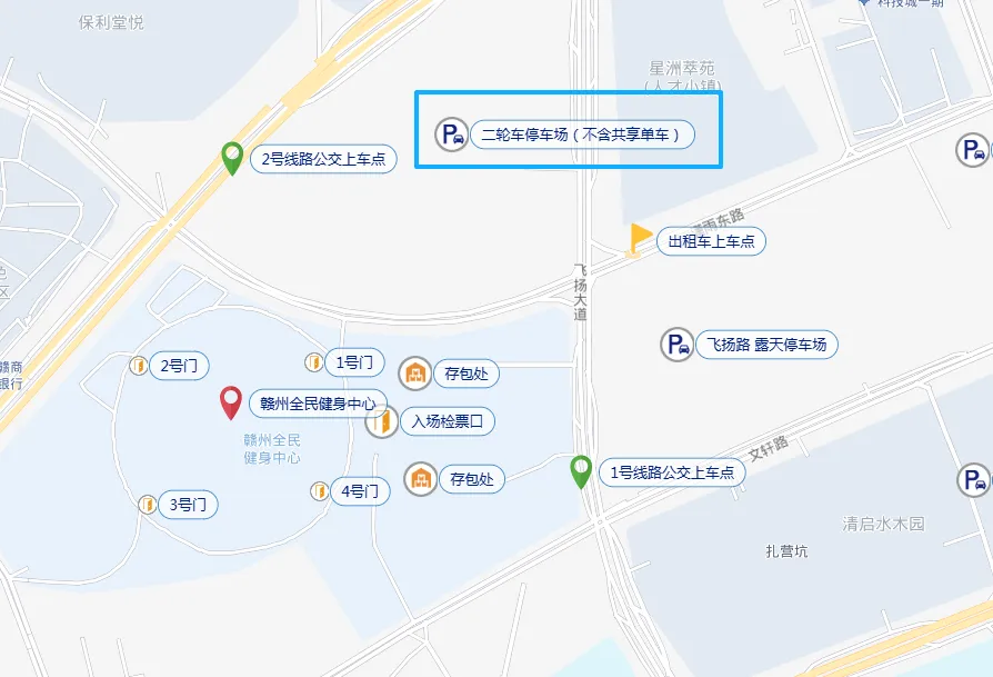自驾前往全民健身中心的歌迷朋友,请参考如下停车示意图将车辆停放在相应位置。“鸟巢”周边部分机动车道及辅道允许实行双向停放,启迪科技城一期停车场(需收费)、二期停车场(需收费)、星洲萃苑停车场(需收费)可停放,以及部分露天停车场可供停放,赣南师范大学、赣南医科大学、赣州师范高等专科学校校内停车场可停放。(注:当停车场停满车辆后,进口封闭,请选择其他停车场)