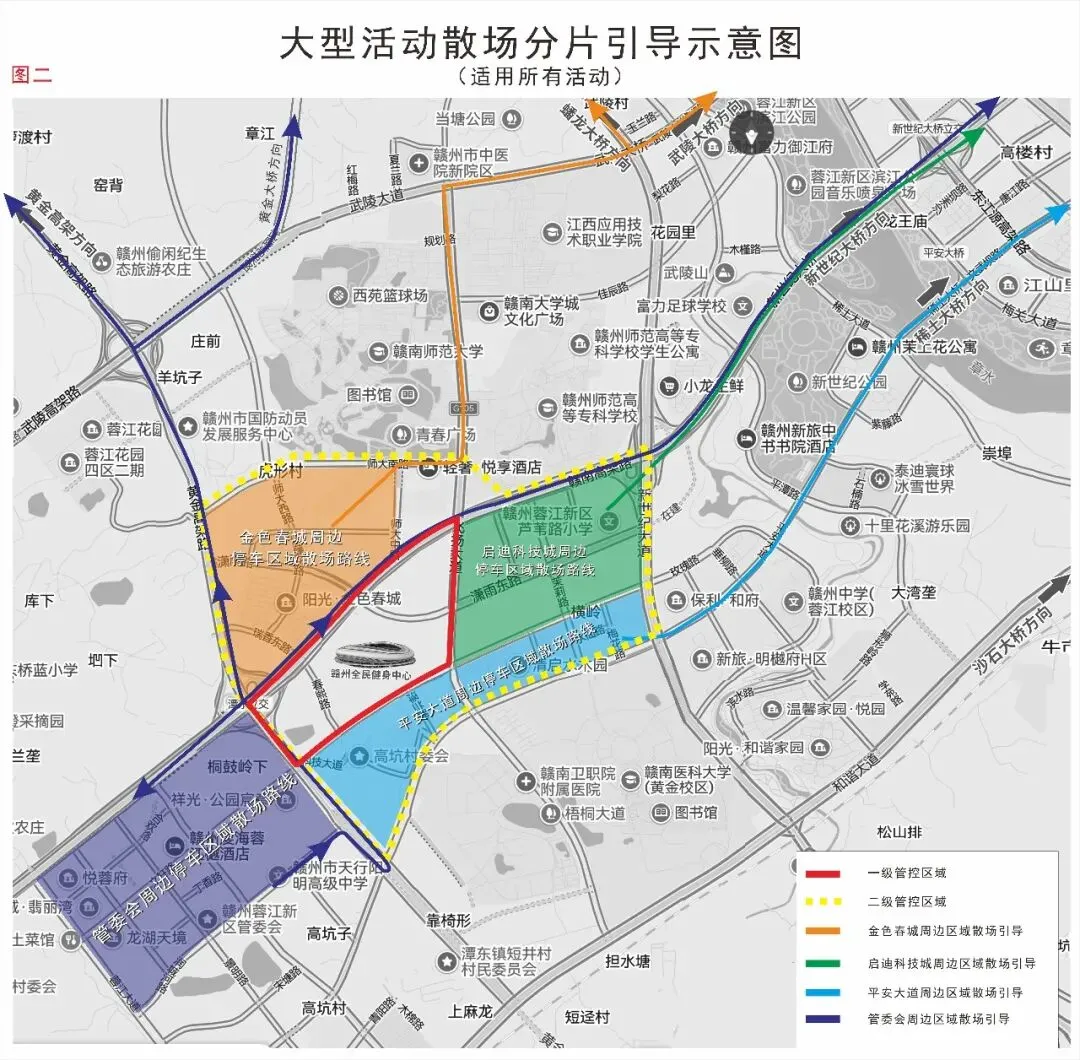 特别提醒:散场期间(预计21:30~22:30)人流车流量巨大,核心区域路段实行车辆只出不进,公交车在飞扬大道及赣南大道上车点等候,管控期间共享单车等二轮车禁止驶入一级管控区域,车辆行驶方向皆为由内往外走;出租车在潇雨东路排队候客,搭乘网约车的歌迷朋友请参考以下散场交通管控图,到蓝色电子围栏(含)外区域进行打车,共享单车在散场前将在一级管控区域外投放。