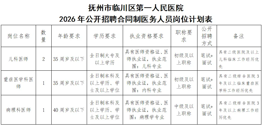 抚州市临川区第一人民医院2026年面向社会公开招聘合同制医务人员4名,其中儿科医师2名,重症医学科医师1名,病理科医师1名(具体岗位要求详见附件1)。