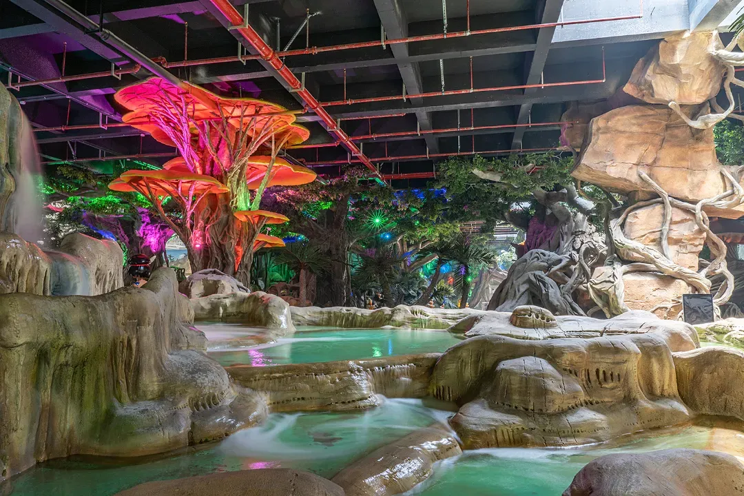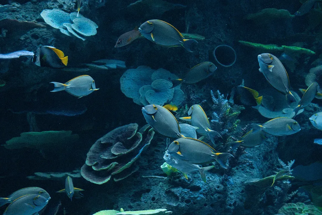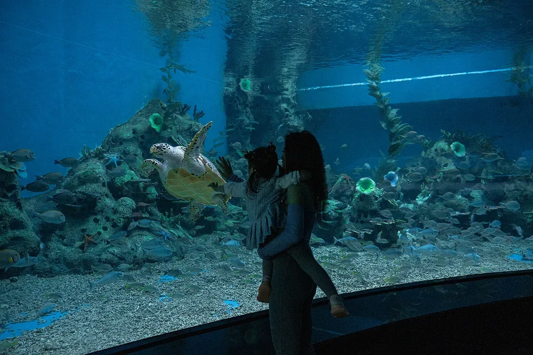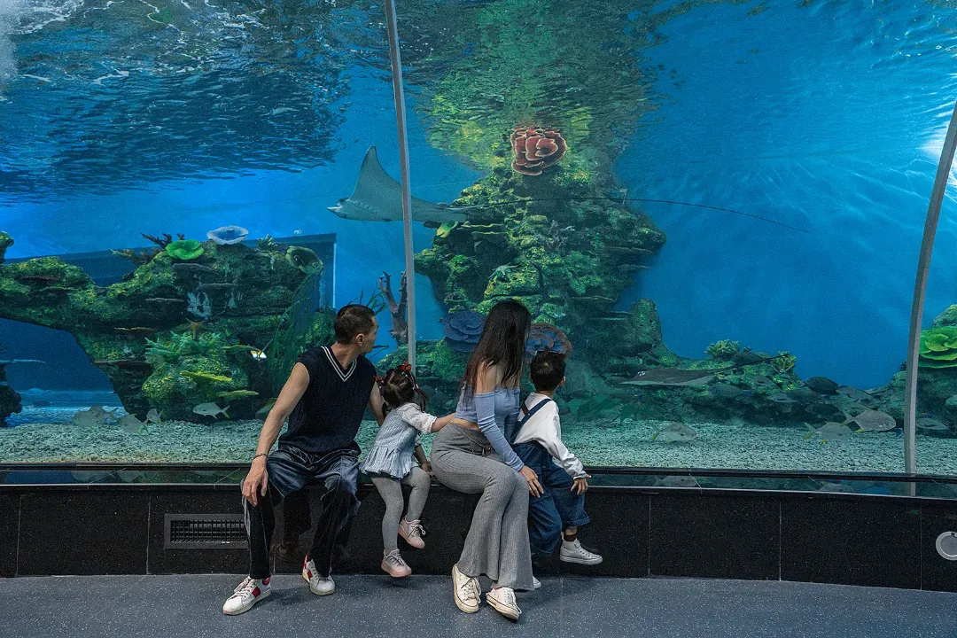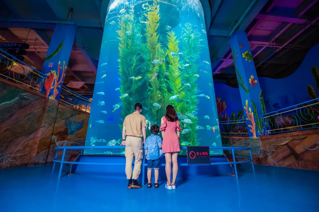 置身于水晶般的亚克力展缸前,不仅能仰望它雄伟壮观、富丽堂皇的身姿,还能看到里面瑰丽绚烂的热带珊瑚礁生态环境,以及各种各样的热带鱼游玩嬉戏。