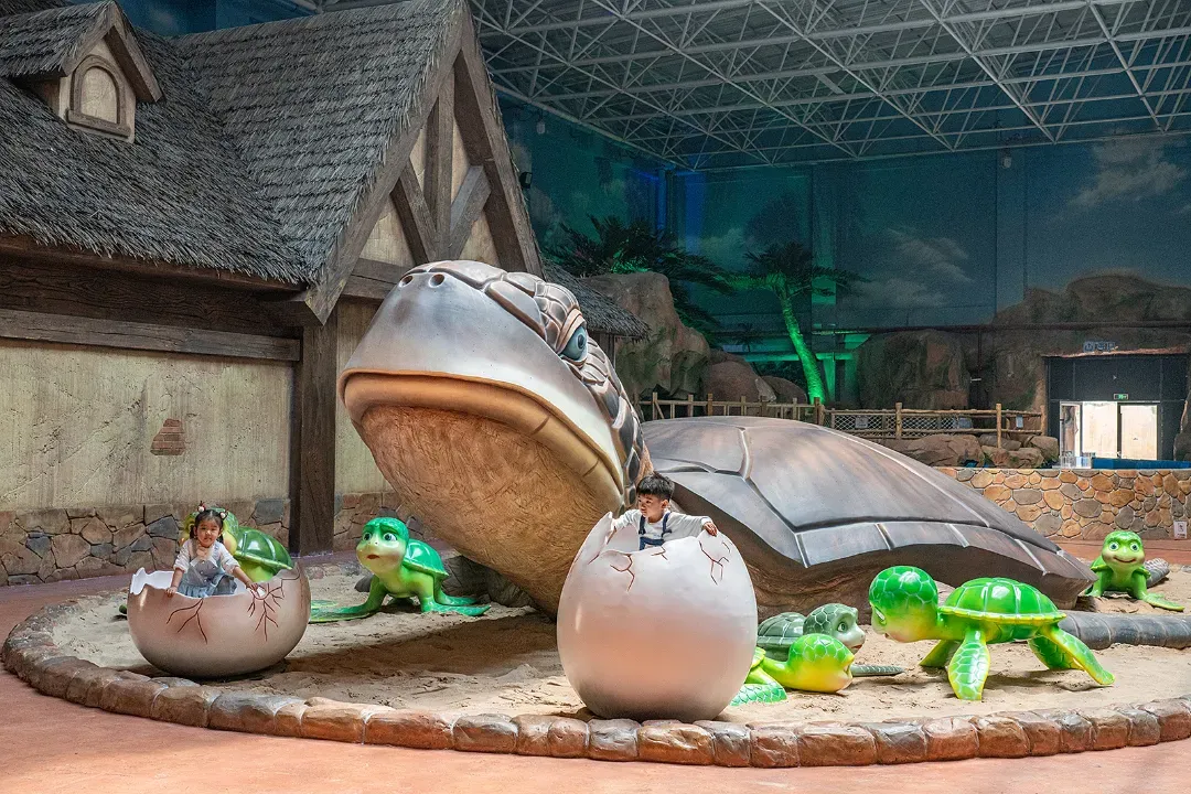 一旁还有个巨型海龟带着小海龟们组成的大沙池,宝贝们在坚硬的龟壳上跳跃、玩耍,十分欢乐。