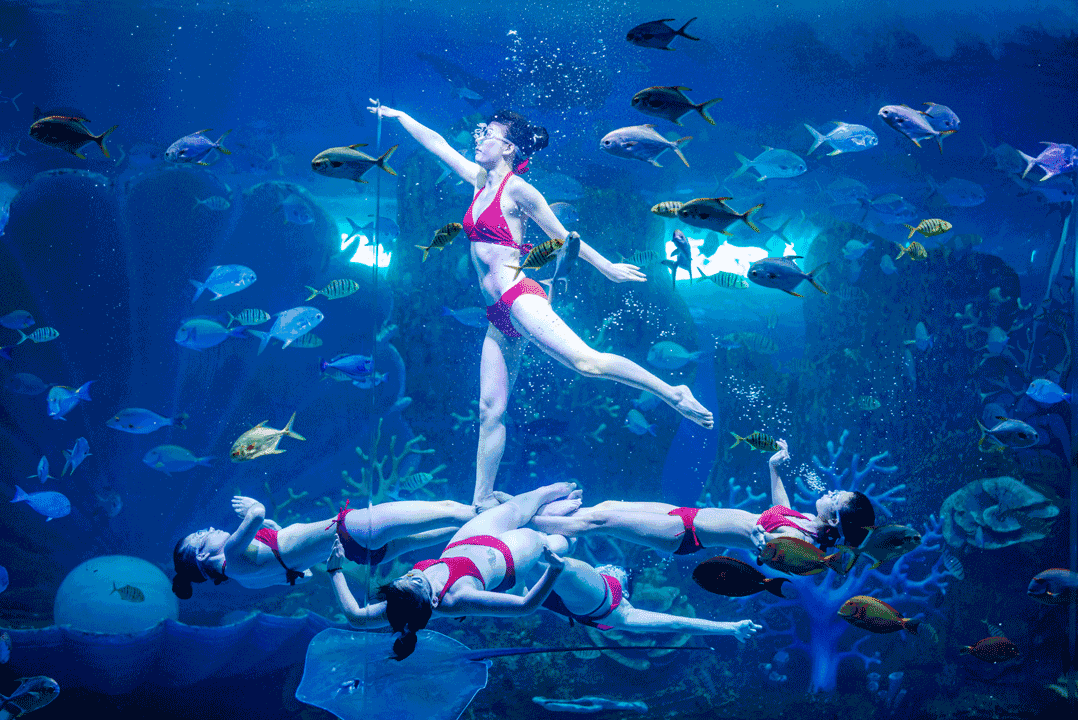高度10米、直径8米、壁厚长达40公分的圆柱展缸,壮观雄伟,瑰丽多姿。