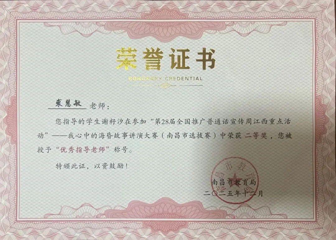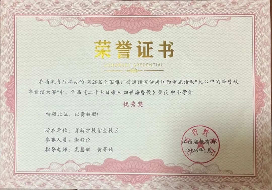 谢籽汐同学凭借其精心准备的讲演作品《二十七日帝王四世海昏侯》,以生动的语言、深厚的理解与饱满的感染力,将海昏侯的历史故事娓娓道来,不仅展现了出色的语言表达能力与舞台风采,更体现了对家乡历史文化的深入探索与热爱。这份荣誉,既是她个人勤奋努力的结晶,也是我校坚持立德树人、注重学生综合素质培养的成果展现。
