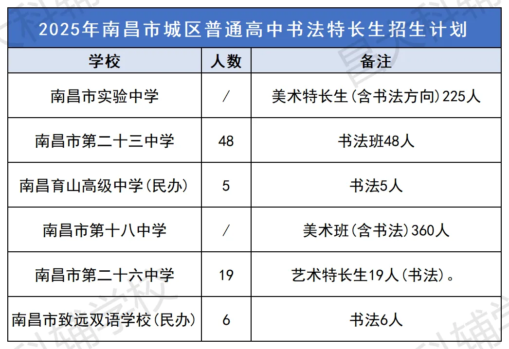 2025年南昌中考书法特长生招生学校及计划