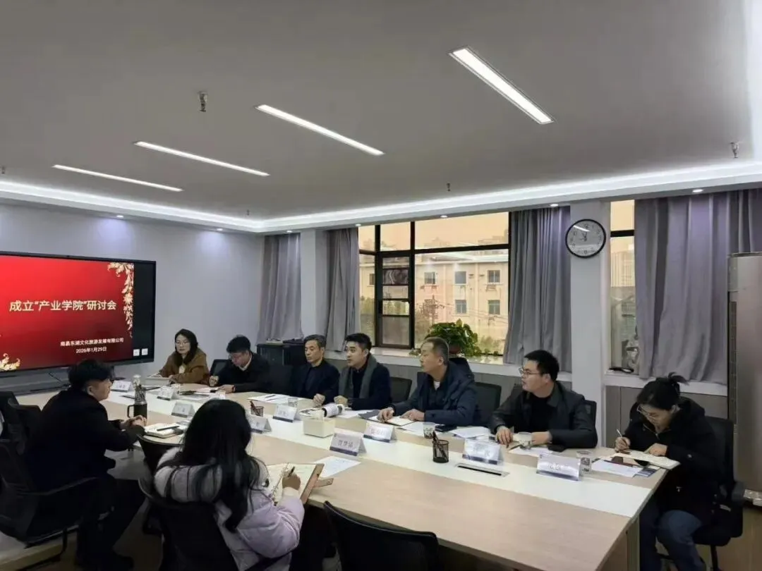 为增进校企联系,拓宽合作视野,2026年1月29日上午,江西财经大学现代经济管理学院、南昌东湖文化旅游发展有限公司(以下简称东湖区文旅公司)与江西英豪傅睿教育集团有限公司三方代表齐聚南昌东湖文旅公司,就共同成立“产业学院”举行专题研讨会,共商产教融合新路径。江西财经大学现代经济管理学院商学院院长邱俊钦、国际交流中心主任高飞、国际交流中心副主任王珊珊,南昌东湖文化旅游发展有限公司董事长程航、总经理卜斌、副总经理贾梦涵,江西英豪傅睿教育集团董事长徐根柱、总经理刘魏、产教融合负责人邹计明、政务主任龙包兰共同参加了本次研讨会,会议由东湖文旅董事长程航主持。
