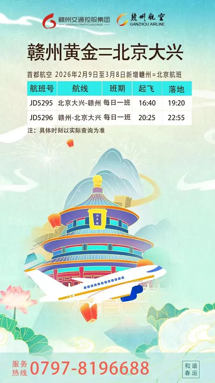 此次新增的赣州黄金机场=北京大兴机场航线由首都航空执飞,每日一班,具体时刻为:北京大兴机场16:40起飞,19:20抵达赣州黄金机场;赣州黄金机场20:25起飞,22:55抵达北京大兴机场。该航线覆盖2月9日至3月8日的春运返乡与返程高峰阶段,共计28天,使赣州黄金机场至北京航线日均达到三班运行,进一步提升了两地之间的航空通达性和时刻灵活性。