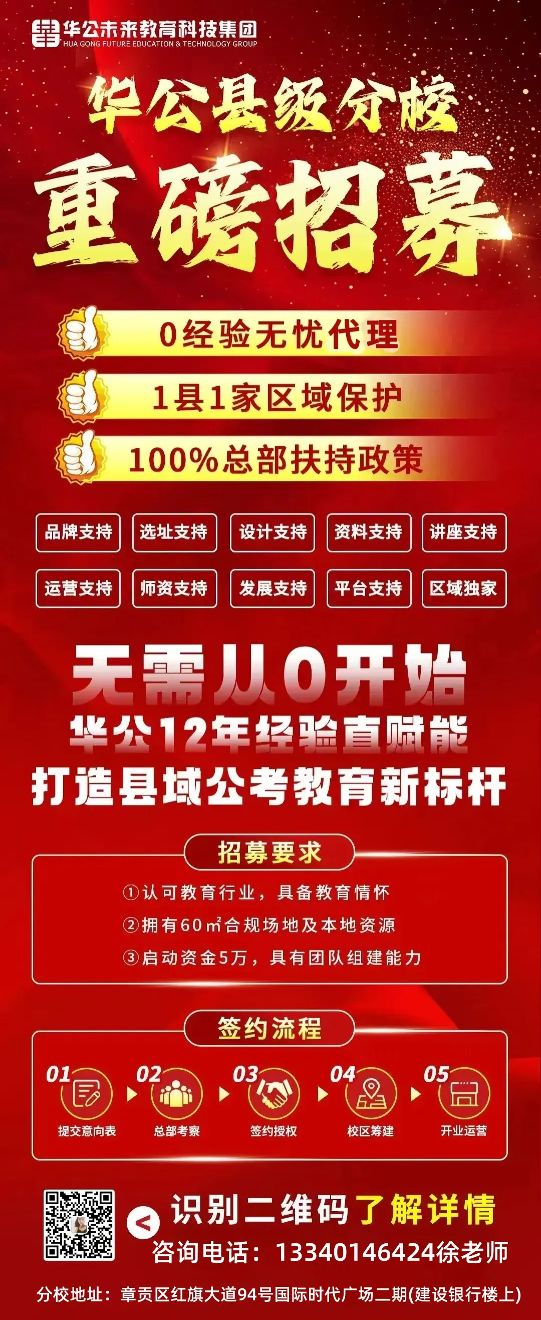 有强烈创业决心,具有品牌意识;认同华公经营理念,将华公教育作为自己的事业。在当地具备良好社会人脉资源,熟悉当地教育培训市场状况;至少需要1名专职管理人员负责招生及日常运营工作。