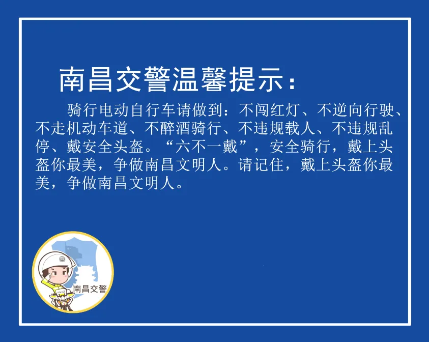 大力推行电动自行车不闯红灯、不逆向行驶、不走机动车道、不醉酒骑行、不违规载人、不违规乱停和戴安全头盔,即“六不一戴”规范管理标准,营造更加安全、畅通、文明、有序的道路交通环境。