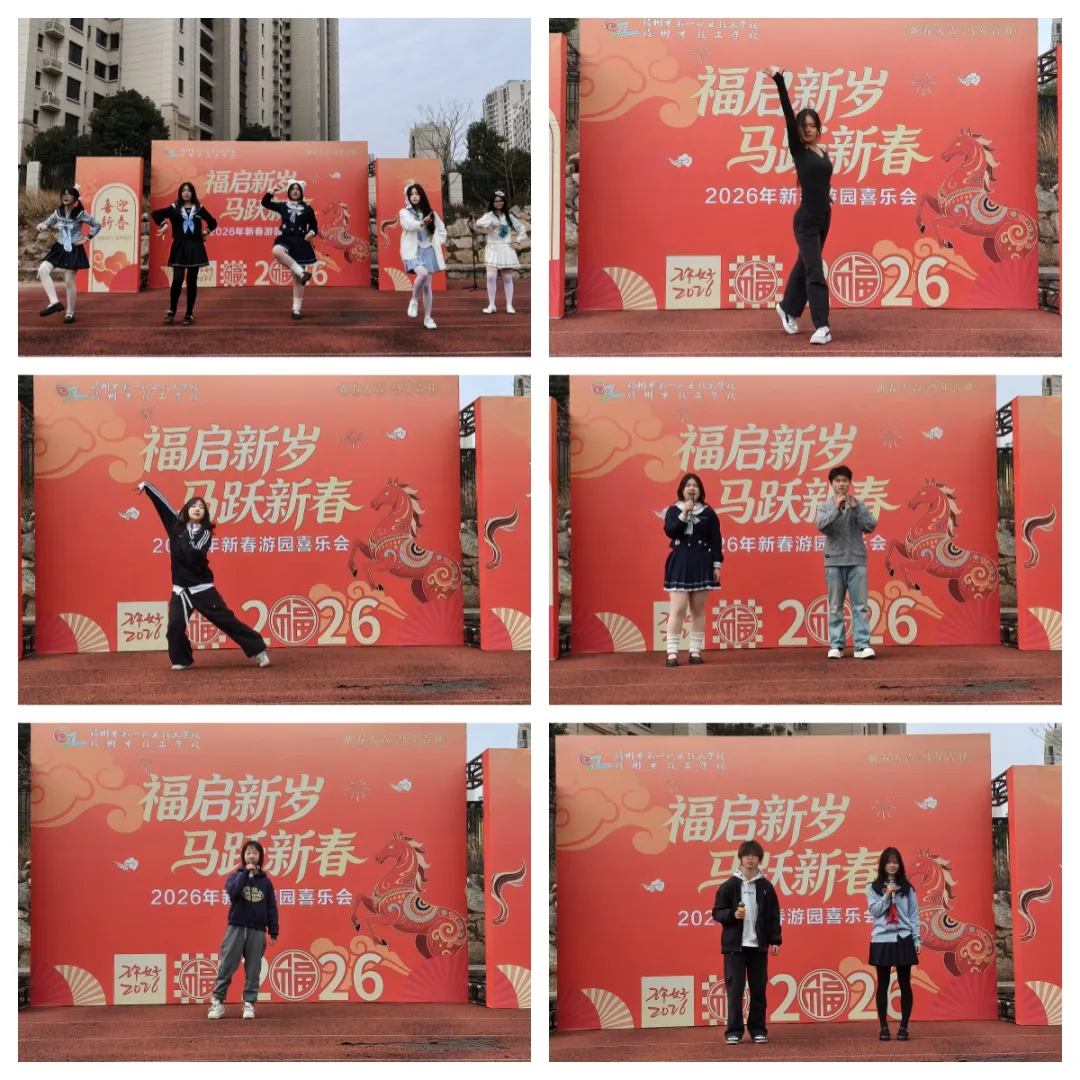 田径场中央的潮流展示小舞台同样人气爆棚。“潮玩新春歌舞绽放”环节中,通关的学生选手轮番登台,以动感的旋律与真挚的表演赢得台下阵阵掌声,为游园会增添了青春活力。